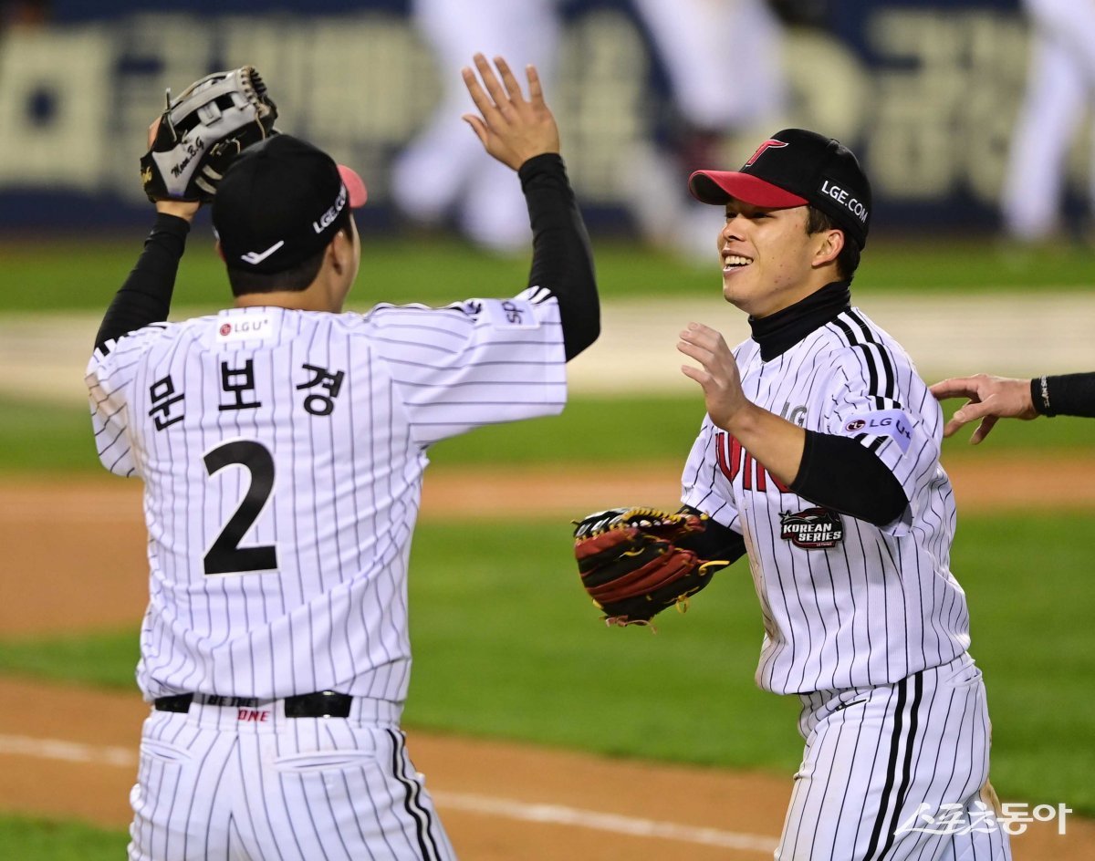 7일 서울 잠실야구장에서 열린 ‘2023 KBO 포스트시즌’ LG 트윈스와 KT 위즈의 한국시리즈 1차전 경기에서 6회초 2사 KT에 뜬공을 잡은 LG 문성주가 동료와 기쁨을 나누고 있다.