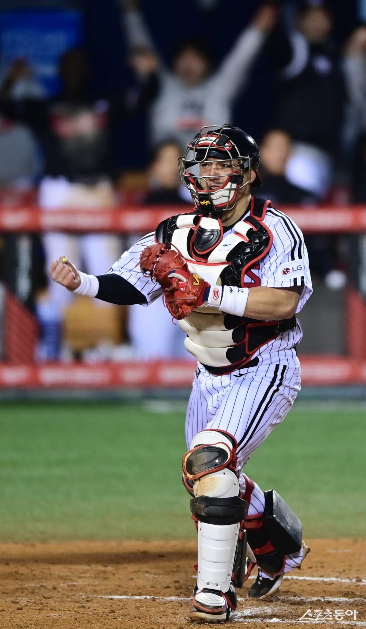 7일 서울 잠실야구장에서 열린 ‘2023 KBO 포스트시즌’ LG 트윈스와 KT 위즈의 한국시리즈 1차전 경기에서 7회초 2사 1, 2루 KT에 중전 안타 때 2루주자를 태그 아웃시킨 LG 박동원이 주먹을 쥐며 기뻐하고 있다.