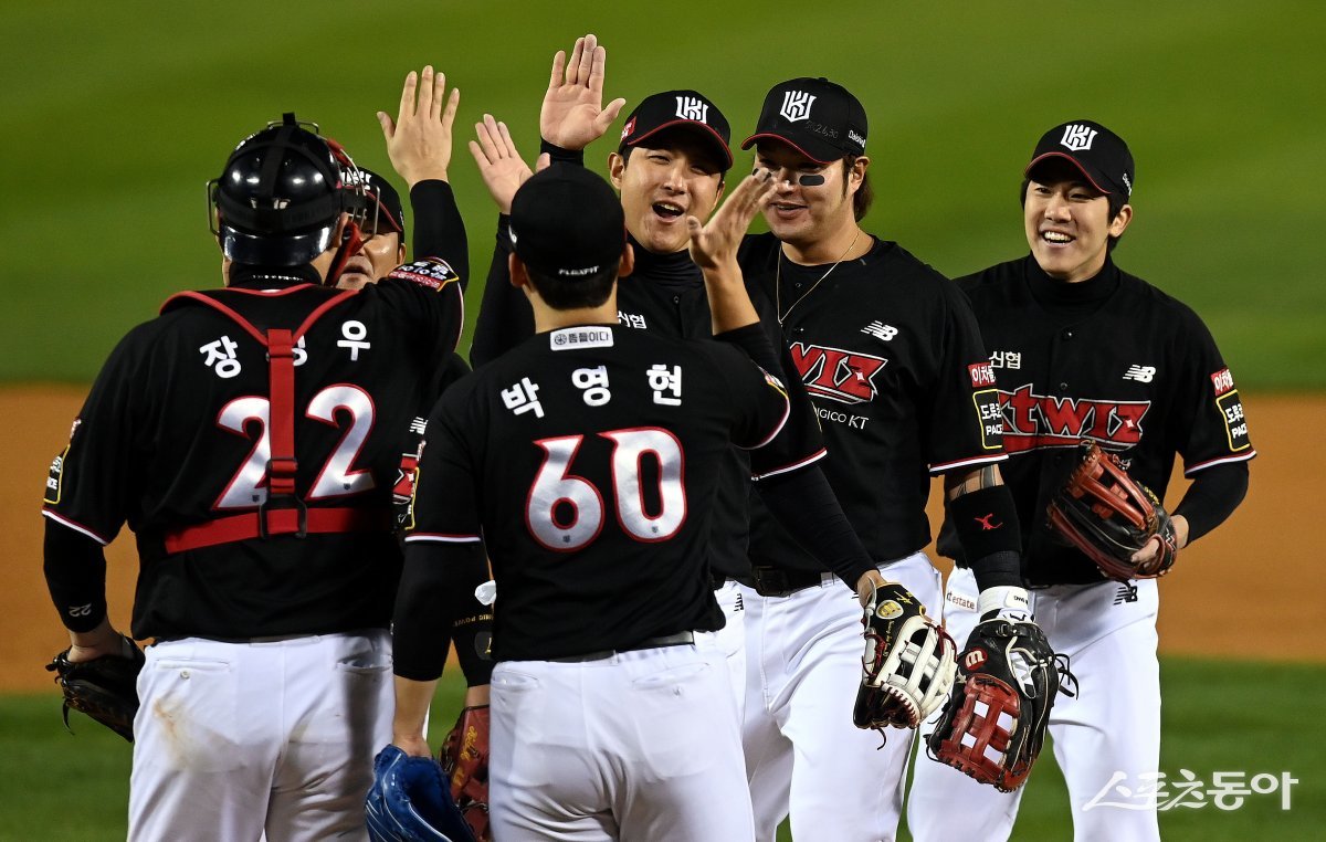 7일 서울 잠실야구장에서 ‘2023 신한은행 SOL KBO리그’ LG 트윈스와 kt 위즈의 한국시리즈 1차전 경기가 열렸다. kt가 LG를 상대로 3-2 승리를 거둔 후 선수들이 그라운드에서 기쁨을 나누고 있다.