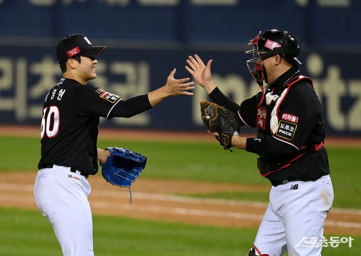 7일 서울 잠실야구장에서 ‘2023 신한은행 SOL KBO리그’ 포스트시즌 한국시리즈 1차전 KT 위즈와 LG 트윈스 경기가 열렸다. 3-2 승리를 거둔 KT 박영현이 장성우와 하이파이브 하고 있다.