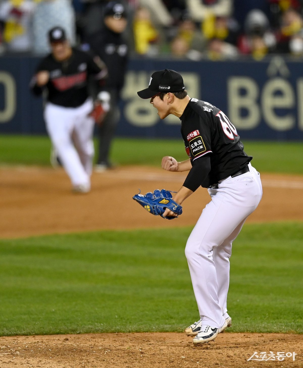 7일 서울 잠실야구장에서 ‘2023 신한은행 SOL KBO리그’ 포스트시즌 한국시리즈 1차전 KT 위즈와 LG 트윈스 경기가 열렸다. 3-2 승리를 거둔 후 KT 박영현이 기뻐하고 있다.