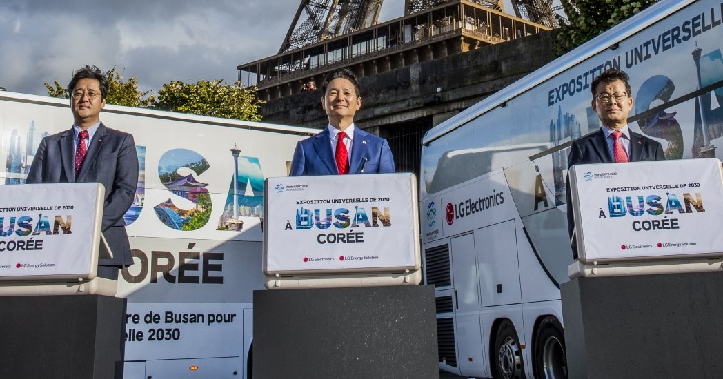 이날 LG전자와 LG에너지솔루션은 2층 대형 버스 두 대에 부산의 매력을 소개하는 랜드마크와 함께 엑스포 유치 염원을 보여주는 래핑광고를 선보였다. LG는 파리 시내버스 2028대의 측면 혹은 전면에 부산엑스포 유치를 기원하는 메시지를 담은 광고를 게재했다. LG가 운영하는 총 2030대의 부산엑스포 버스는 다양한 노선으로 구성돼 에펠탑, 루브르 박물관, 샹젤리제 거리 등 파리 도심에 위치한 대표적 명소 뿐 아니라, 파리 외곽까지 누비며 ‘달리는 홍보대사’ 역할을 한다.