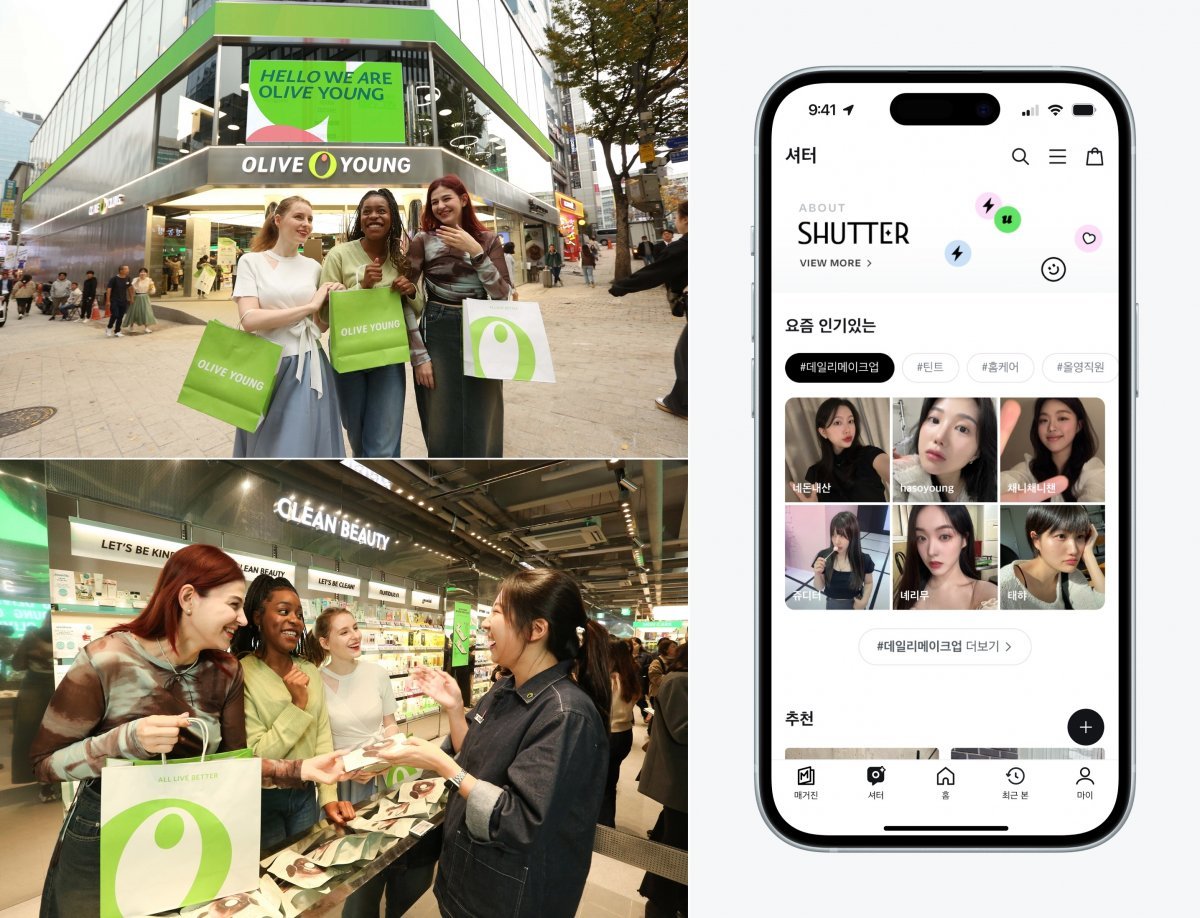 CJ올리브영이 온·오프라인 매장을 통한 고객 경험을 강화하고 있다. ‘올리브영 명동 타운’을 찾은 외국인 고객들(왼쪽)과 자사 모바일 앱에 도입한 SNS형 커뮤니티 서비스 ‘셔터’. 사진제공 | CJ올리브영
