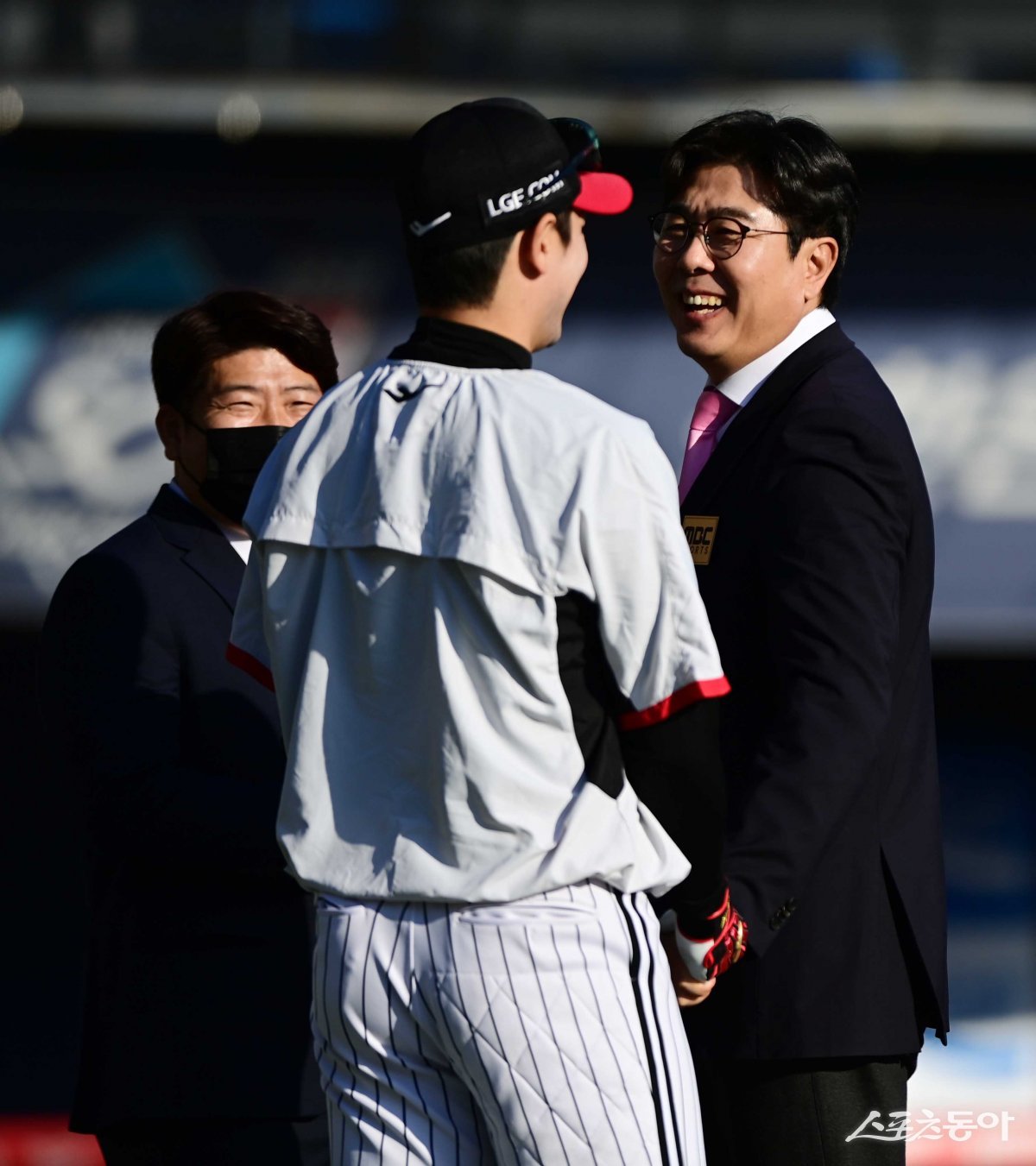 8일 서울 잠실야구장에서 열린 ‘2023 KBO 포스트시즌’ LG 트윈스와 KT 위즈의 한국시리즈 2차전 경기에 앞서 박재홍 해설위원, 정민철 해설위원이 LG 선수와 이야기를 하고 있다.