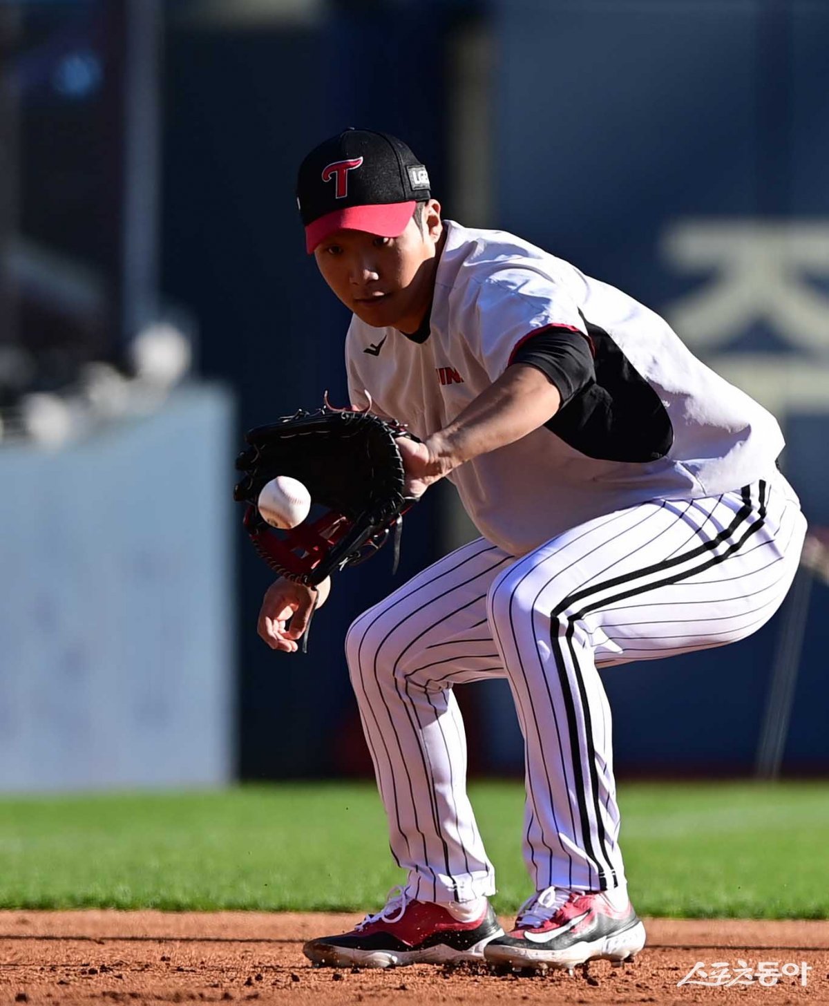 8일 서울 잠실야구장에서 열린 ‘2023 KBO 포스트시즌’ LG 트윈스와 KT 위즈의 한국시리즈 2차전 경기에 앞서 LG 문보경이 수비 훈련을 하고 있다.