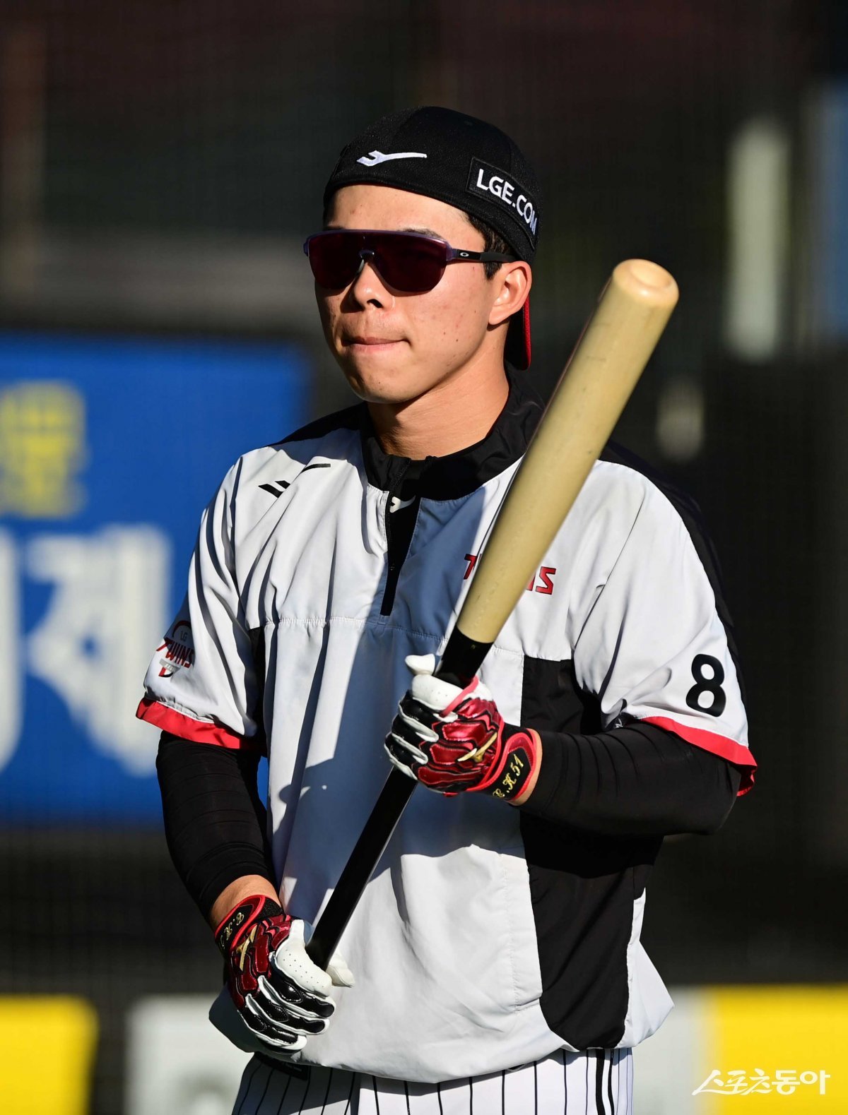 8일 서울 잠실야구장에서 열린 ‘2023 KBO 포스트시즌’ LG 트윈스와 KT 위즈의 한국시리즈 2차전 경기에 앞서 LG 문성주가 훈련을 하고 있다.