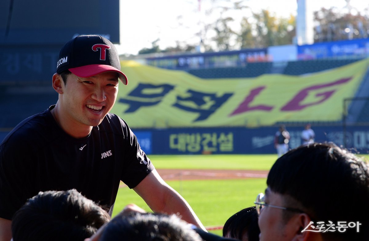 8일 서울 잠실야구장에서 ‘2023 신한은행 SOL KBO리그’ LG 트윈스와 kt 위즈의 한국시리즈 2차전 경기가 열린다. 경기 전 LG 박해민이 인터뷰를 하고 있다.