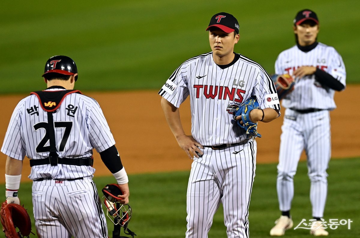 8일 서울 잠실야구장에서 ‘2023 신한은행 SOL KBO리그’ LG 트윈스와 kt 위즈의 한국시리즈 2차전 경기가 열렸다. 1회초 1사 만루에서 2타점 2루타를 허용한 LG 선발 최원태가 교체되고 있다.