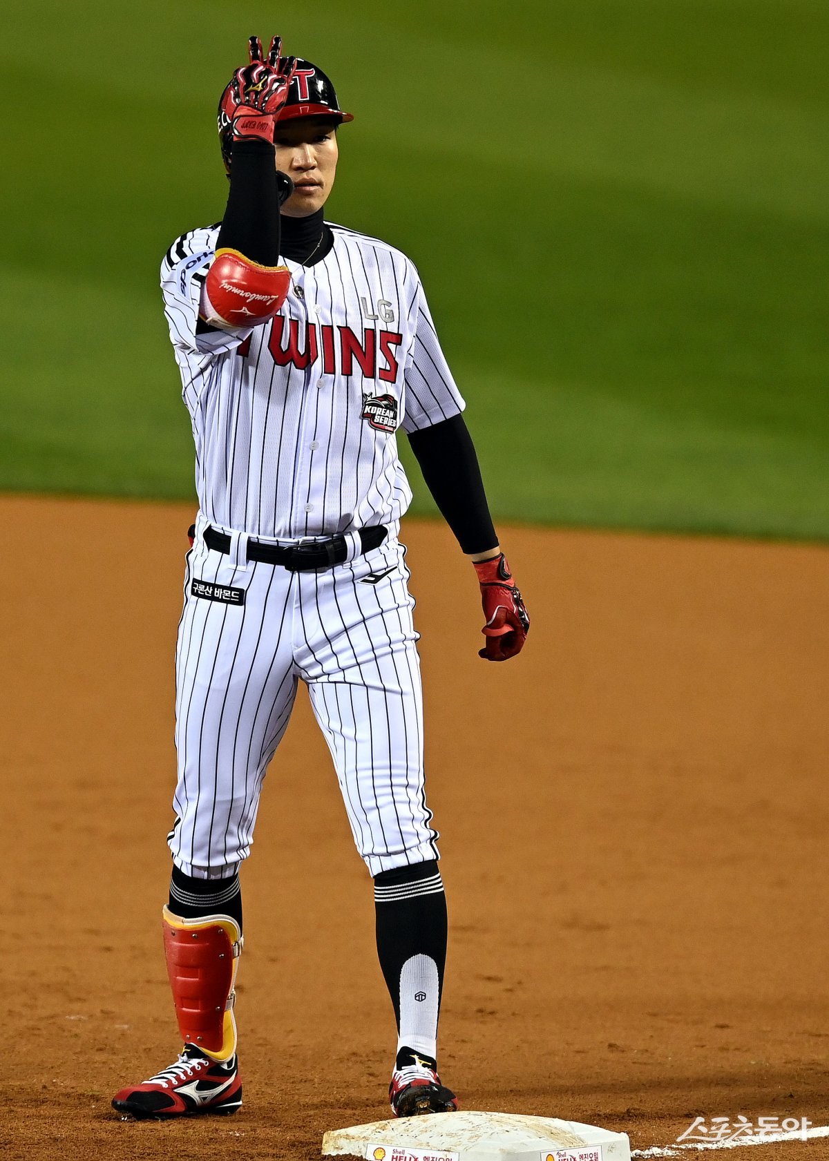 8일 서울 잠실야구장에서 ‘2023 신한은행 SOL KBO리그’ LG 트윈스와 kt 위즈의 한국시리즈 2차전 경기가 열렸다. 1회말 1사에서 LG 박해민이 안타를 날린 후 환호하고 있다.
