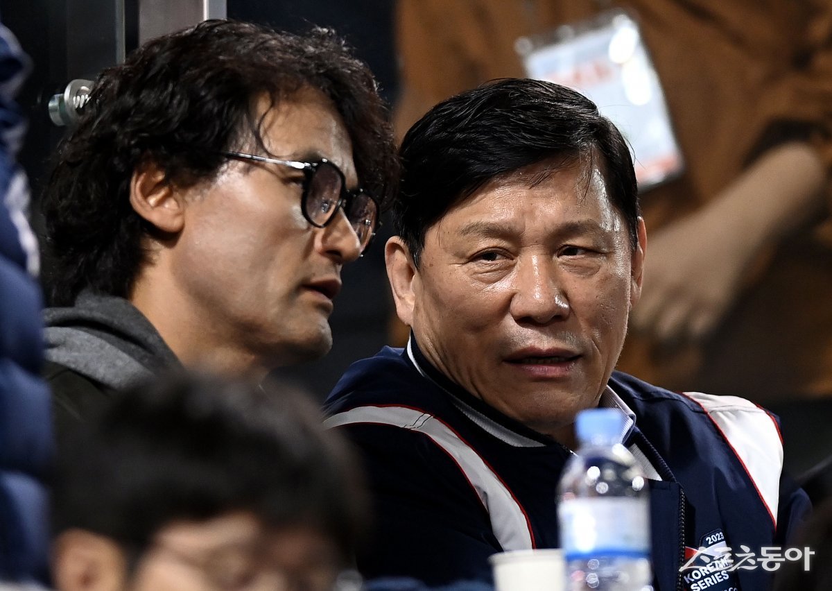 8일 서울 잠실야구장에서 ‘2023 신한은행 SOL KBO리그’ LG 트윈스와 kt 위즈의 한국시리즈 2차전 경기가 열렸다. KBO 허구연 총재가 박찬호와 이야기를 나누고 있다.