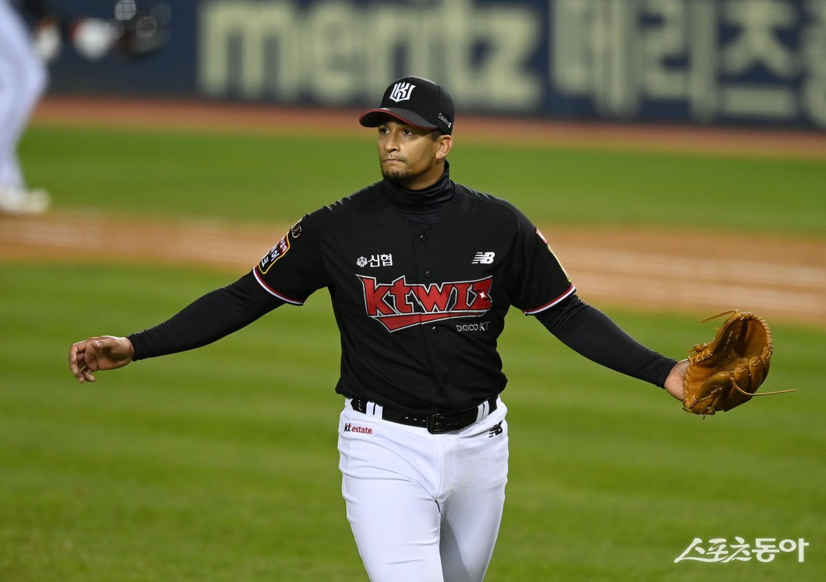 8일 서울 잠실야구장에서 ‘2023 신한은행 SOL KBO리그’ 포스트시즌 한국시리즈 2차전 KT 위즈와 LG 트윈스 경기가 열렸다. 선발 투수로 등판한 KT 쿠에바스가 3회말 1실점 한 후 아쉬워하고 있다.