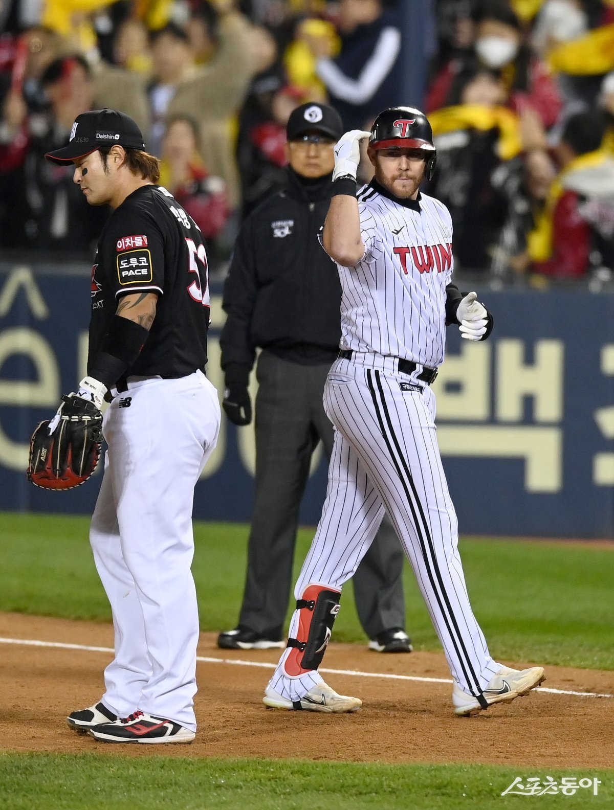 8일 서울 잠실야구장에서 ‘2023 신한은행 SOL KBO리그’ 포스트시즌 한국시리즈 2차전 KT 위즈와 LG 트윈스 경기가 열렸다. 3회말 2사 1,3루 LG 오스틴이 1타점 적시타를 치고 1루에서 기뻐하고 있다.