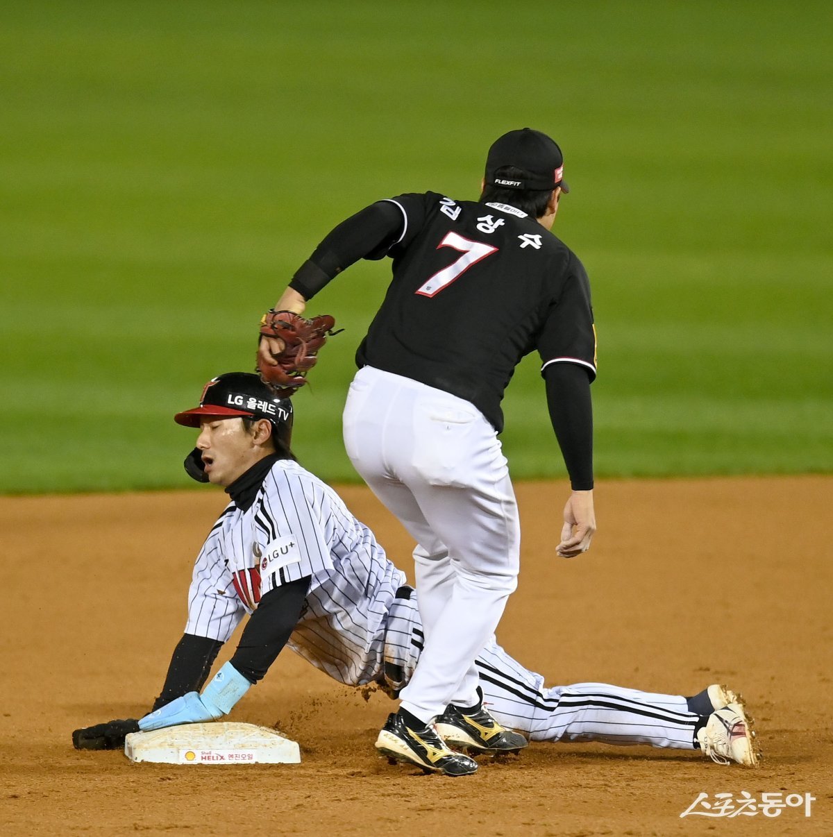8일 서울 잠실야구장에서 ‘2023 신한은행 SOL KBO리그’ 포스트시즌 한국시리즈 2차전 KT 위즈와 LG 트윈스 경기가 열렸다. 3회말 무사 1루 상황에서 LG 1루주자 신민재가 2루 도루를 시도했으나 아웃되고 있다.