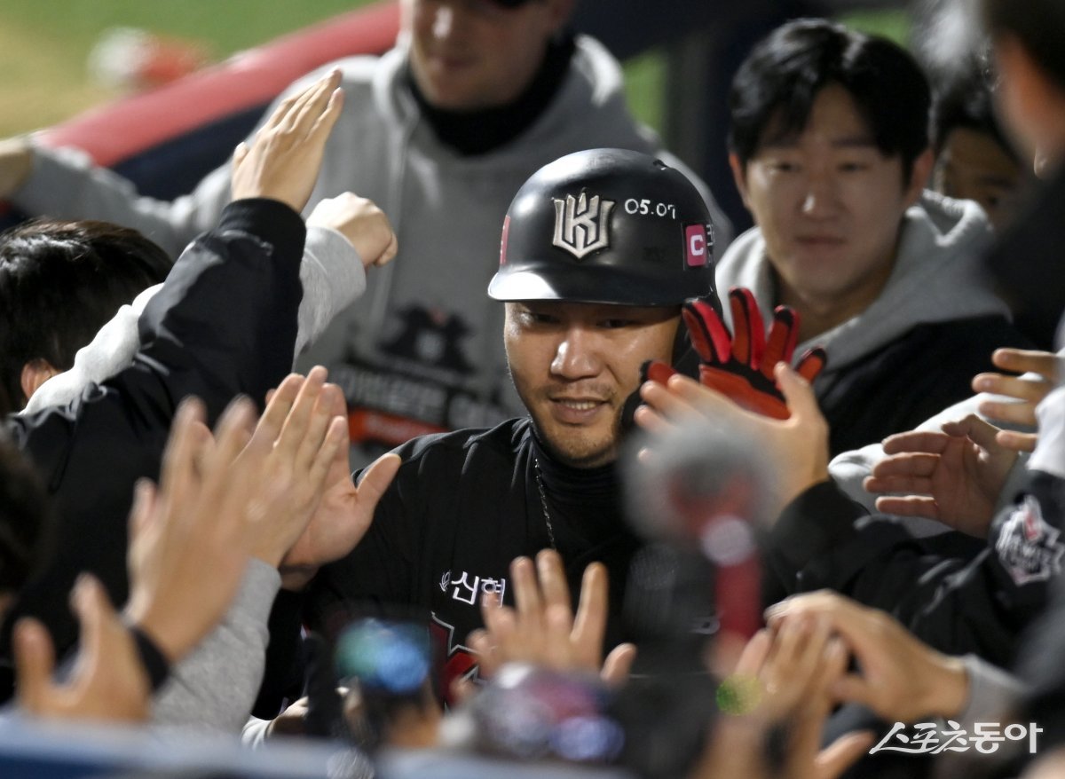 8일 서울 잠실야구장에서 ‘2023 신한은행 SOL KBO리그’ 포스트시즌 한국시리즈 2차전 KT 위즈와 LG 트윈스 경기가 열렸다. 1회초 1사 2,3루 KT 안타 때 득점한 장성우가 하이파이브 하고 있다.