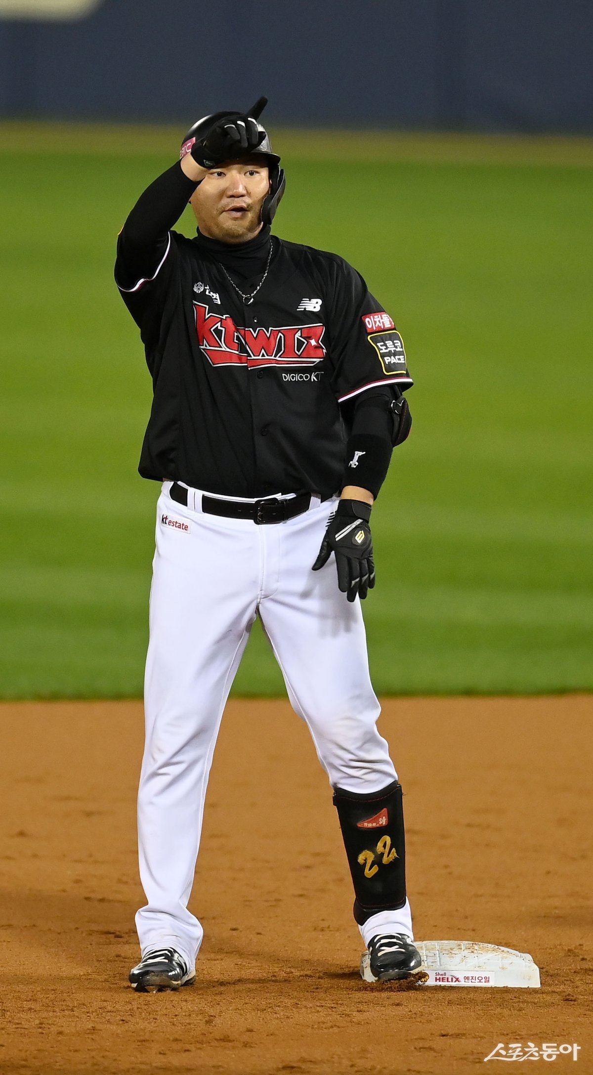 8일 서울 잠실야구장에서 ‘2023 신한은행 SOL KBO리그’ 포스트시즌 한국시리즈 2차전 KT 위즈와 LG 트윈스 경기가 열렸다. 1회초 1사 만루 KT 장성우가 선제 2타점 좌전 2루타를 치고 2루에서 기뻐하고 있다.