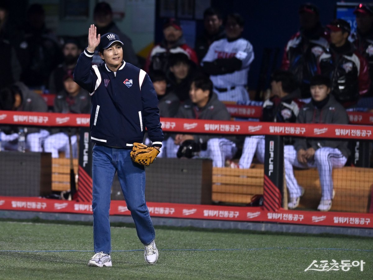 7일 서울 잠실야구장에서 ‘2023 신한은행 SOL KBO리그’ 포스트시즌 한국시리즈 2차전 KT 위즈와 LG 트윈스 경기가 열렸다. 시구자로 나선 배우 정우성이 팬들에게 인사하고 있다.