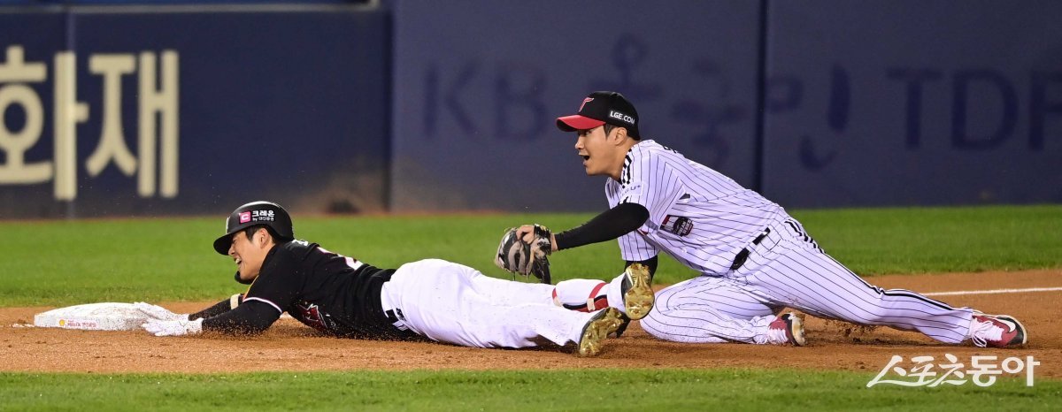 8일 서울 잠실야구장에서 열린 ‘2023 KBO 포스트시즌’ LG 트윈스와 KT 위즈의 한국시리즈 2차전 경기에서 2회초 1사 KT 조용호가 좌전 2루타를 치고 3루로 파고들었지만 LG 3루수 문보경에게 태그 아웃당하고 있다.
