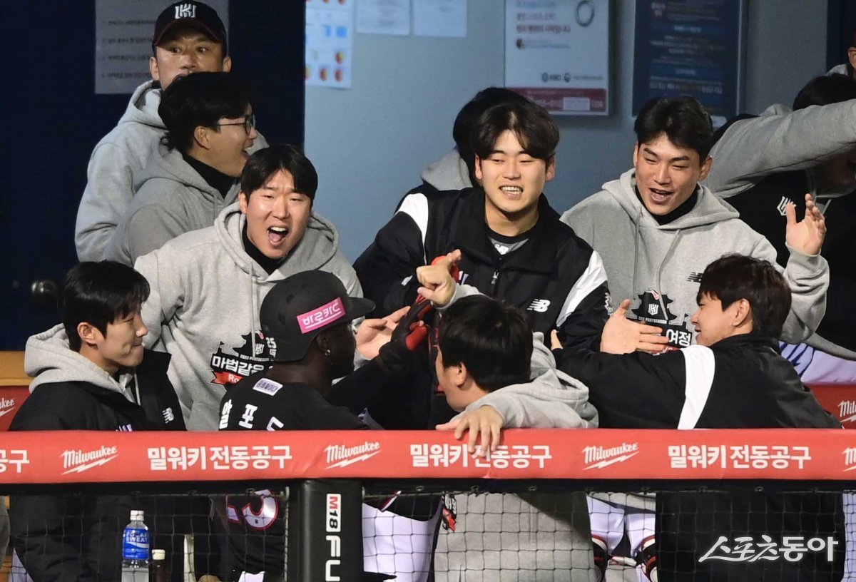 8일 서울 잠실야구장에서 열린 ‘2023 KBO 포스트시즌’ LG 트윈스와 KT 위즈의 한국시리즈 2차전 경기에서 1회초 1사 만루 KT에 적시타 때 득점에 성공한 2루주자 알포드가 더그아웃에서 동료들에 축하를 받고 있다.