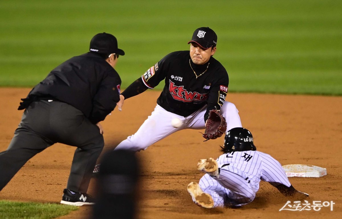 8일 서울 잠실야구장에서 열린 ‘2023 KBO 포스트시즌’ LG 트윈스와 KT 위즈의 한국시리즈 2차전 경기에서 3회말 무사 1루 상황에서 KT 김상수가 도루를 시도한 LG 1루주자를 태그 아웃시키고 있다.