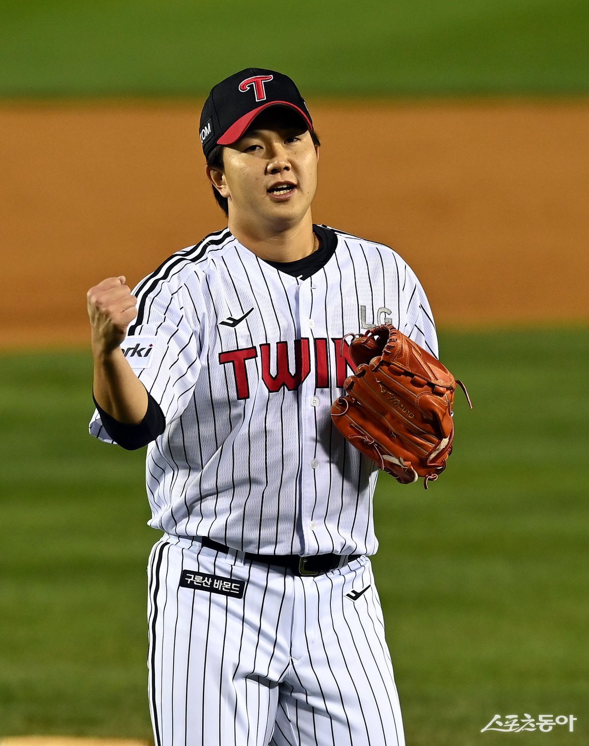8일 서울 잠실야구장에서 ‘2023 신한은행 SOL KBO리그’ LG 트윈스와 kt 위즈의 한국시리즈 2차전 경기가 열렸다. 5회초 2사 1, 2루에서 LG 유영찬이 삼진 아웃을 잡은 후 환호하고 있다.