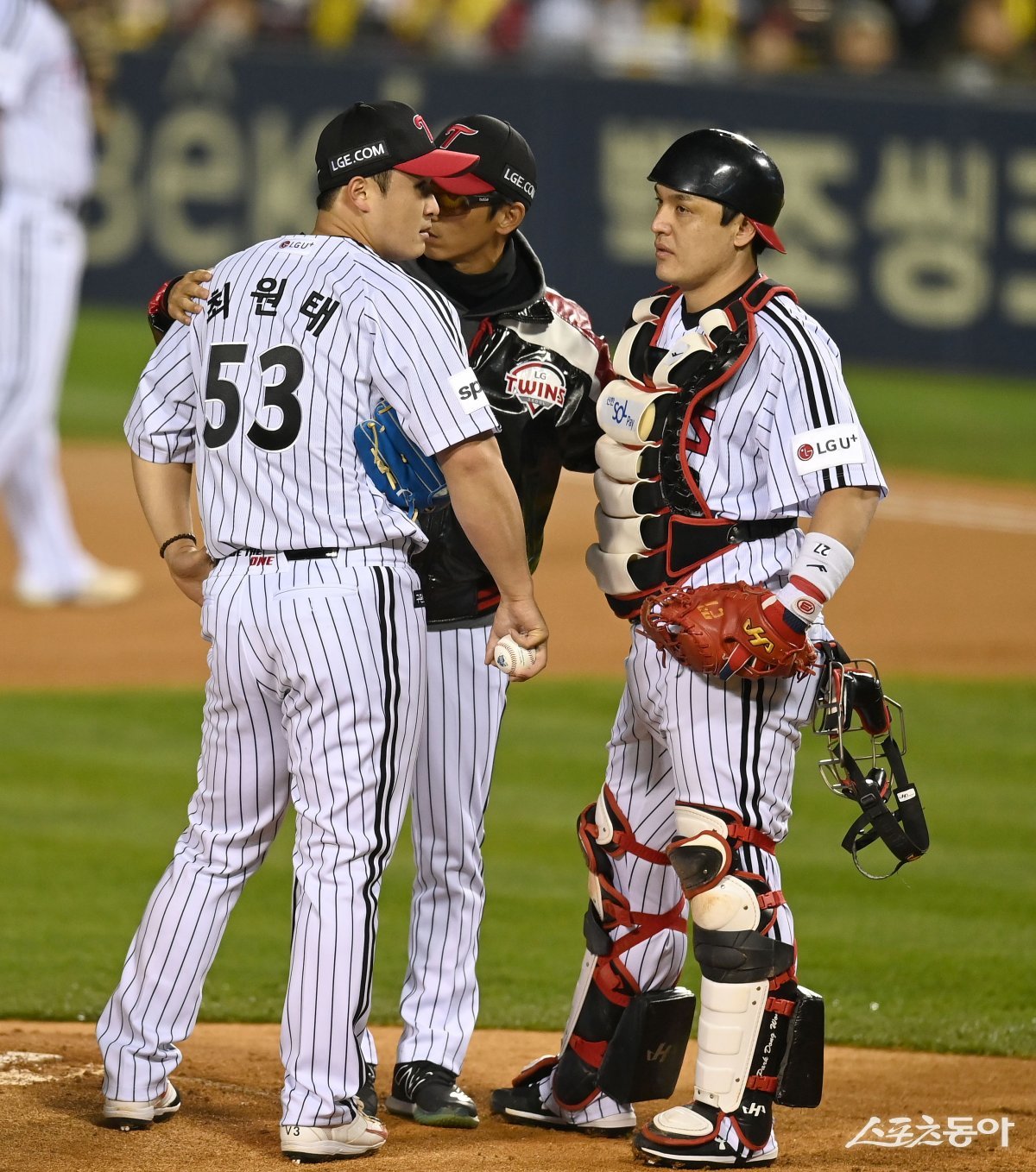 8일 서울 잠실야구장에서 ‘2023 신한은행 SOL KBO리그’ 포스트시즌 한국시리즈 2차전 KT 위즈와 LG 트윈스 경기가 열렸다. 선발 투수로 등판한 LG 최원태가 1회초 무사 볼넷과 안타를 허용하자 코치가 마운드에 올라 이야기하고 있다. 잠실 | 김종원 기자 won@donga.com