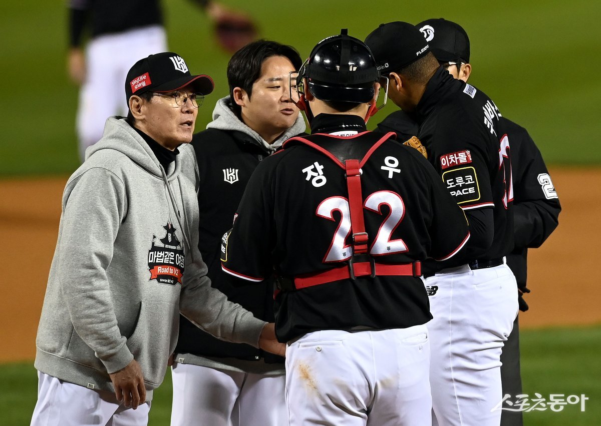 8일 서울 잠실야구장에서 ‘2023 신한은행 SOL KBO리그’ LG 트윈스와 kt 위즈의 한국시리즈 2차전 경기가 열렸다. 6회말 2사 1루에서 kt 이강철 감독이 마운드에 올라 kt 선발 쿠에바스와 이야기를 나누고 있다.