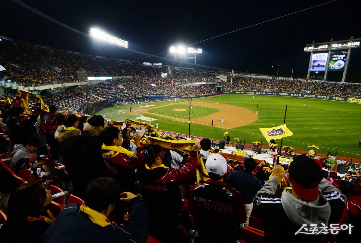 8일 서울 잠실야구장에서 열린 ‘2023 KBO 포스트시즌’ LG 트윈스와 KT 위즈의 한국시리즈 2차전 경기에서 관중들이 응원을 펼치고 있다.