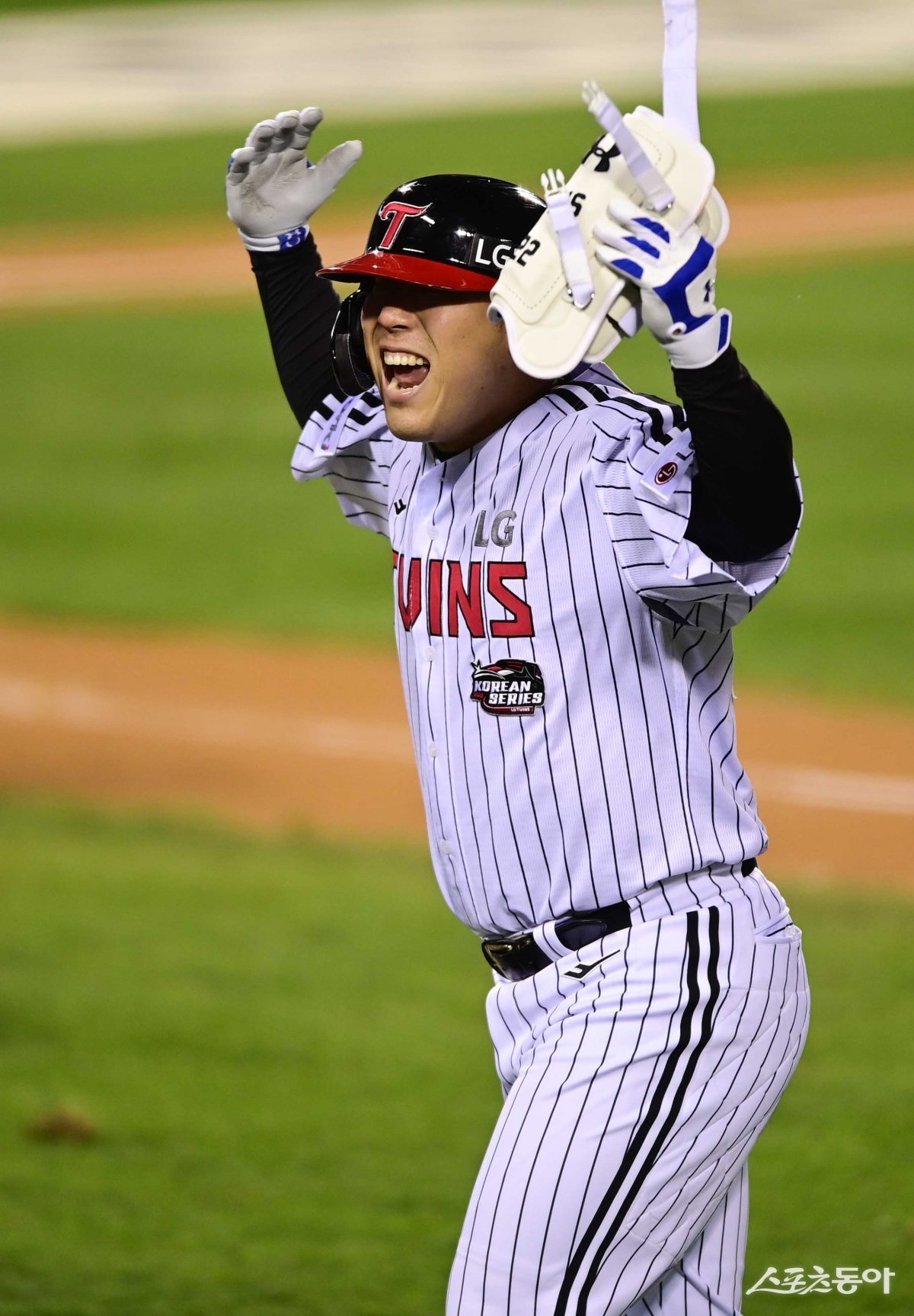 8일 서울 잠실야구장에서 열린 ‘2023 KBO 포스트시즌’ LG 트윈스와 KT 위즈의 한국시리즈 2차전 경기에서 7회말 2사 1루 LG 김현수가 1타점 우전 2루타를 친 후 기뻐하고 있다.