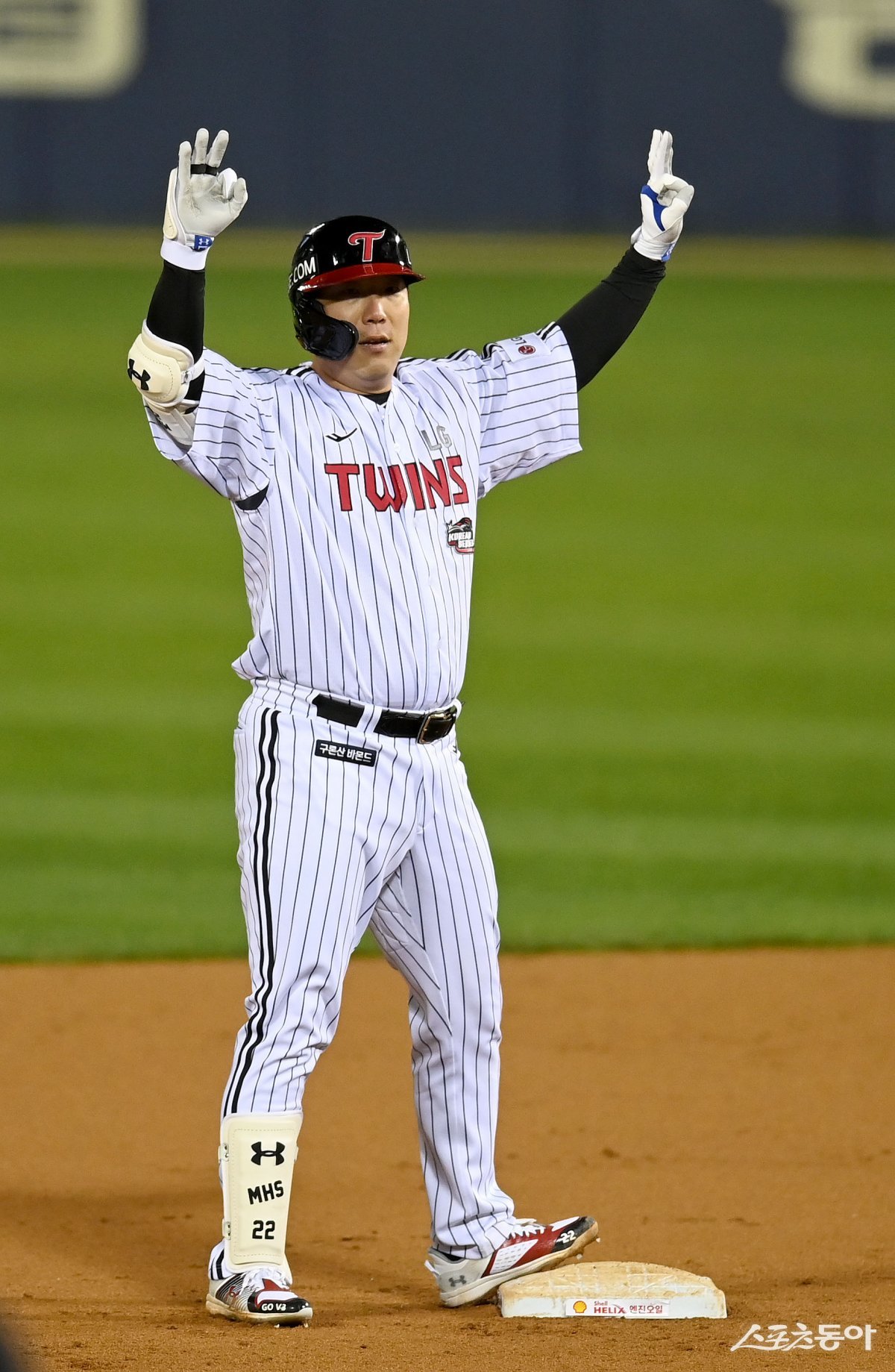 8일 서울 잠실야구장에서 ‘2023 신한은행 SOL KBO리그’ 포스트시즌 한국시리즈 2차전 KT 위즈와 LG 트윈스 경기가 열렸다. 7회말 2사 1루 LG 김현수가 1타점 우전 2루타를 치고 2루에서 기뻐하고 있다.