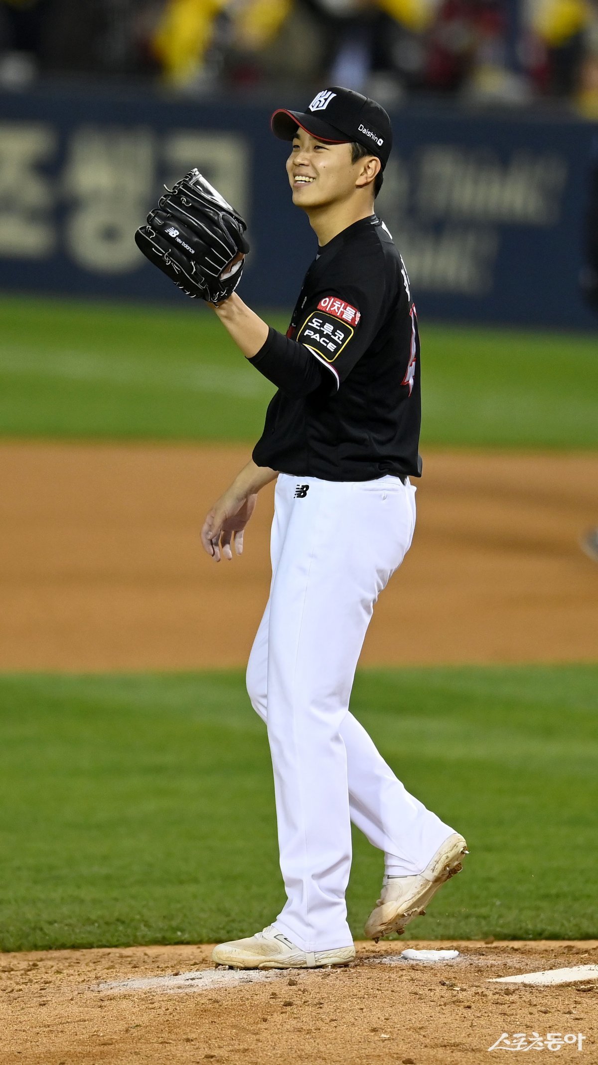 8일 서울 잠실야구장에서 ‘2023 신한은행 SOL KBO리그’ 포스트시즌 한국시리즈 2차전 KT 위즈와 LG 트윈스 경기가 열렸다. 7회말 KT 손동현이 호수비를 펼친 내야수를 향해 웃고 있다.