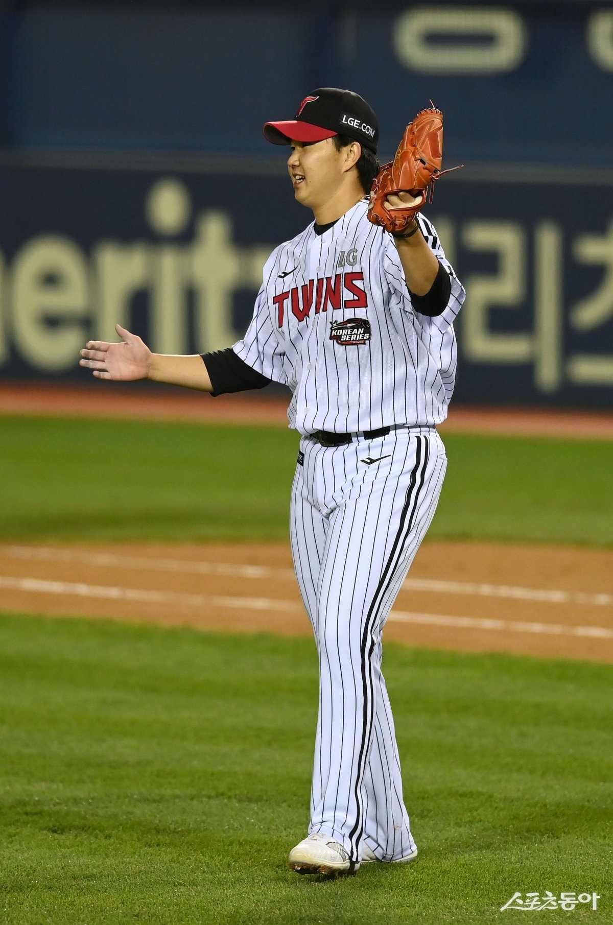 8일 서울 잠실야구장에서 ‘2023 신한은행 SOL KBO리그’ 포스트시즌 한국시리즈 2차전 KT 위즈와 LG 트윈스 경기가 열렸다. 7회초 투구를 마친 LG 유영찬이 박수를 치고 있다.