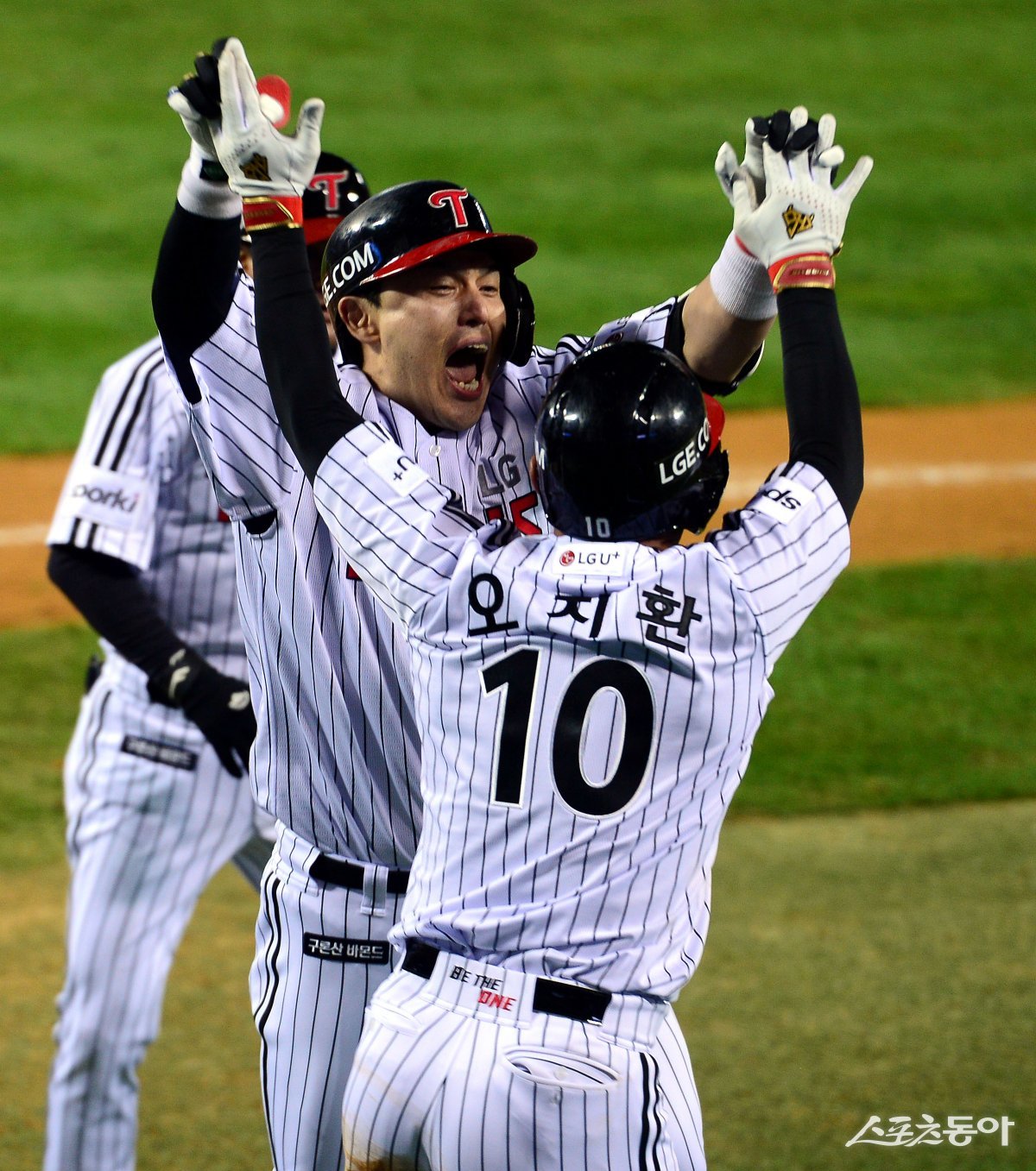 8일 서울 잠실야구장에서 ‘2023 신한은행 SOL KBO리그’ LG 트윈스와 kt 위즈의 한국시리즈 2차전 경기가 열렸다. 8회말 1사 루에서 LG 박동원이 역전 투런 홈런을 쏘아 올린 후 동료와 기쁨을 나누고 있다.