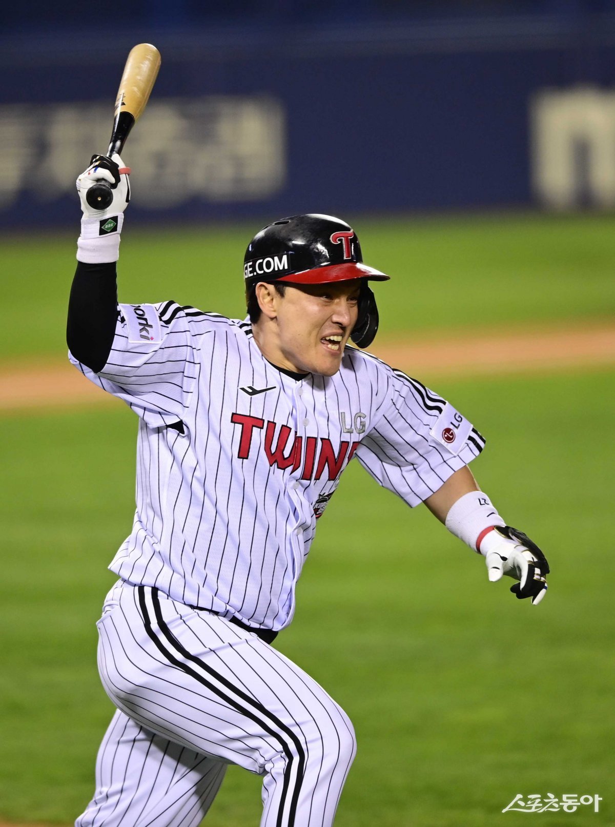 8일 서울 잠실야구장에서 열린 ‘2023 KBO 포스트시즌’ LG 트윈스와 KT 위즈의 한국시리즈 2차전 경기에서 8회말 1사 2루 LG 박동원이 역전 투런 홈런을 친 후 배트를 던지고 있다.