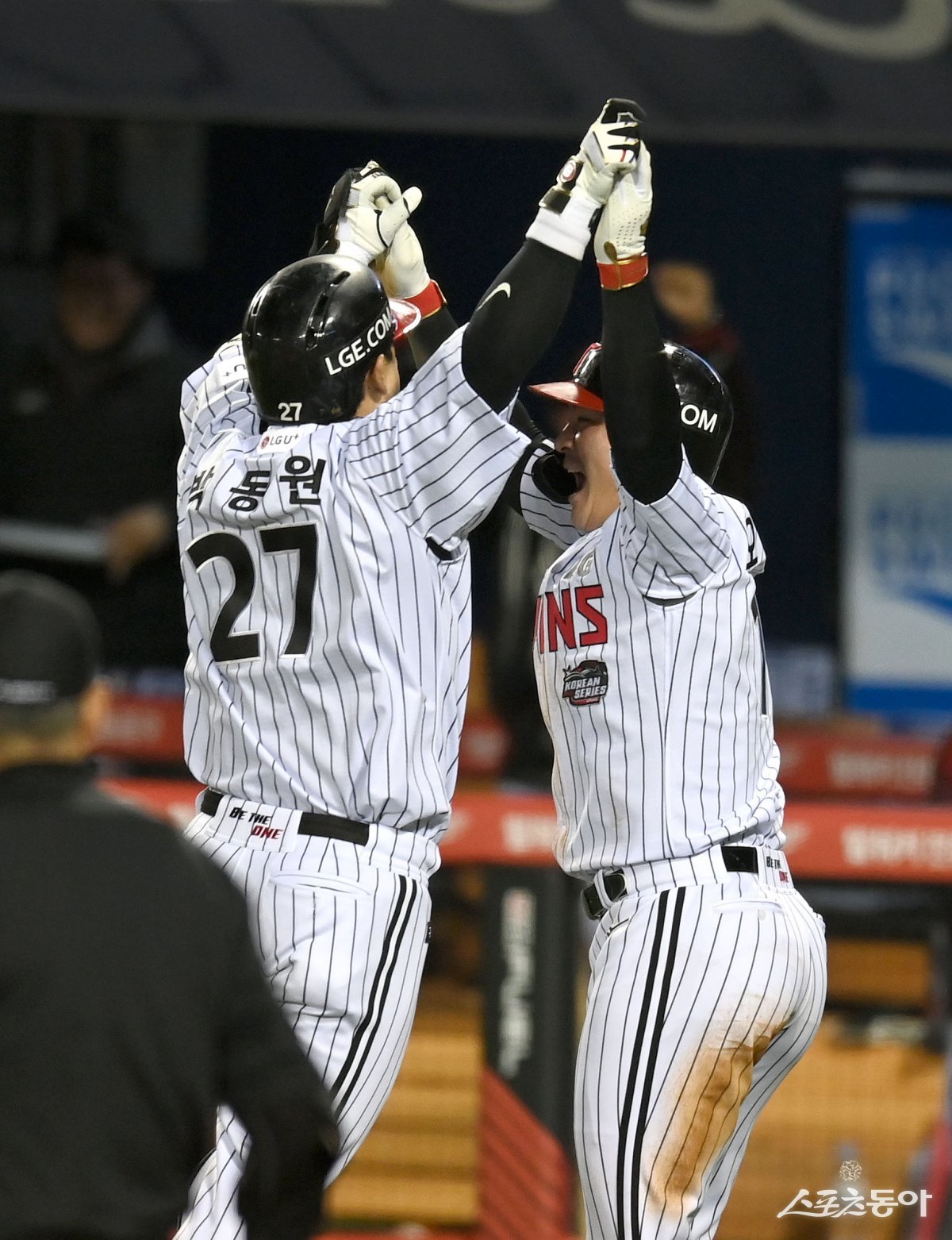 8일 서울 잠실야구장에서 ‘2023 신한은행 SOL KBO리그’ 포스트시즌 한국시리즈 2차전 KT 위즈와 LG 트윈스 경기가 열렸다. 8회말 1사 2루 LG 박동원이 역전 좌월 투런 홈런을 날리고 그라운드를 돌아 홈인해 오지환과 기뻐하고 있다.