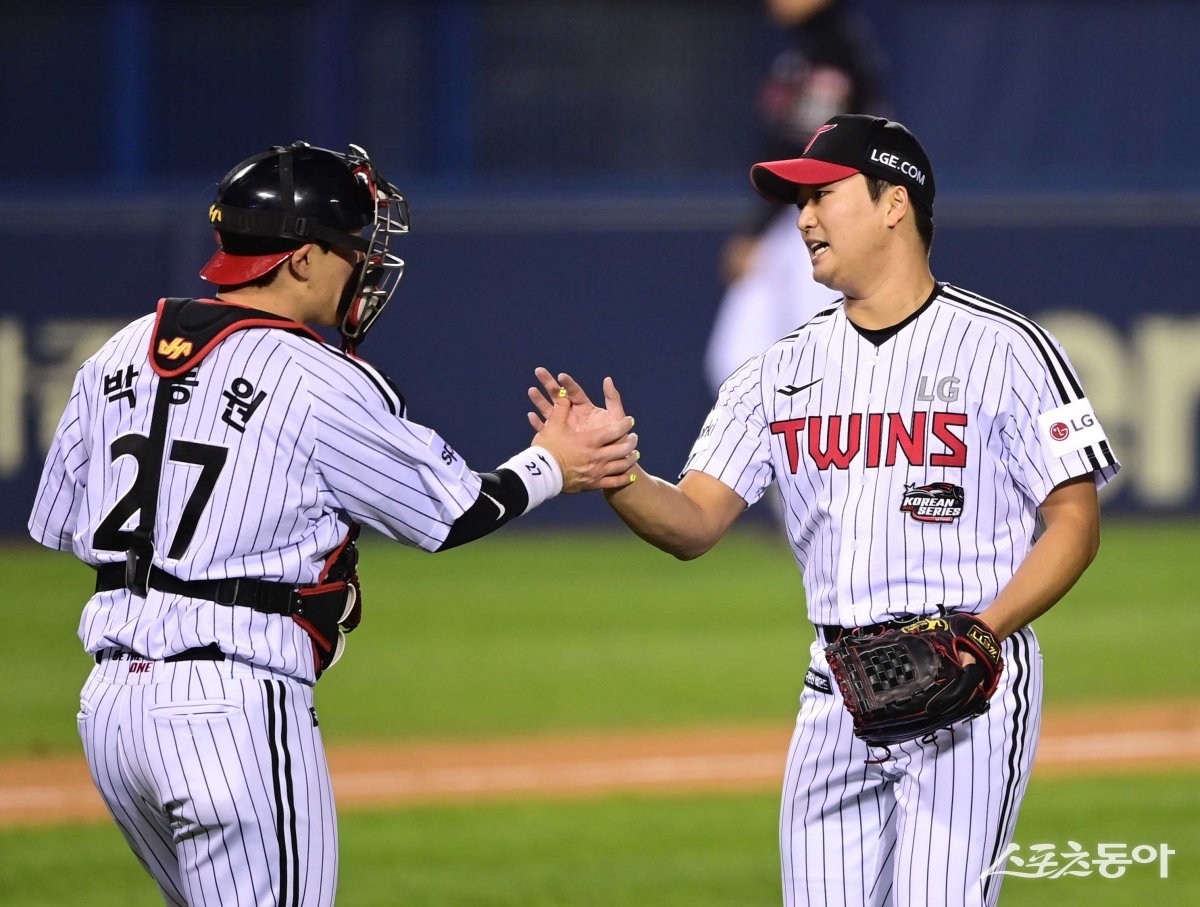 8일 서울 잠실야구장에서 열린 ‘2023 KBO 포스트시즌’ LG 트윈스와 KT 위즈의 한국시리즈 2차전 경기에서 5-4로 승리한 LG 고우석이 포수와 기쁨을 나누고 있다.