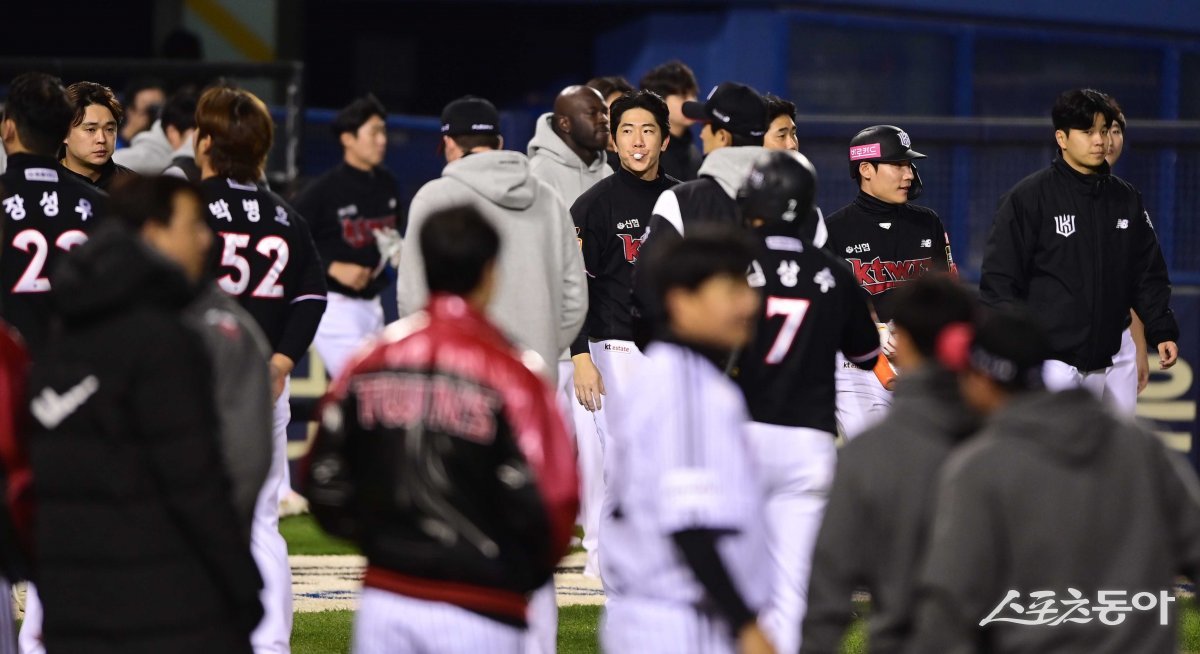 8일 서울 잠실야구장에서 열린 ‘2023 KBO 포스트시즌’ LG 트윈스와 KT 위즈의 한국시리즈 2차전 경기에서 4-5로 역전패한 KT 선수들이 아쉬워하고 있다.
