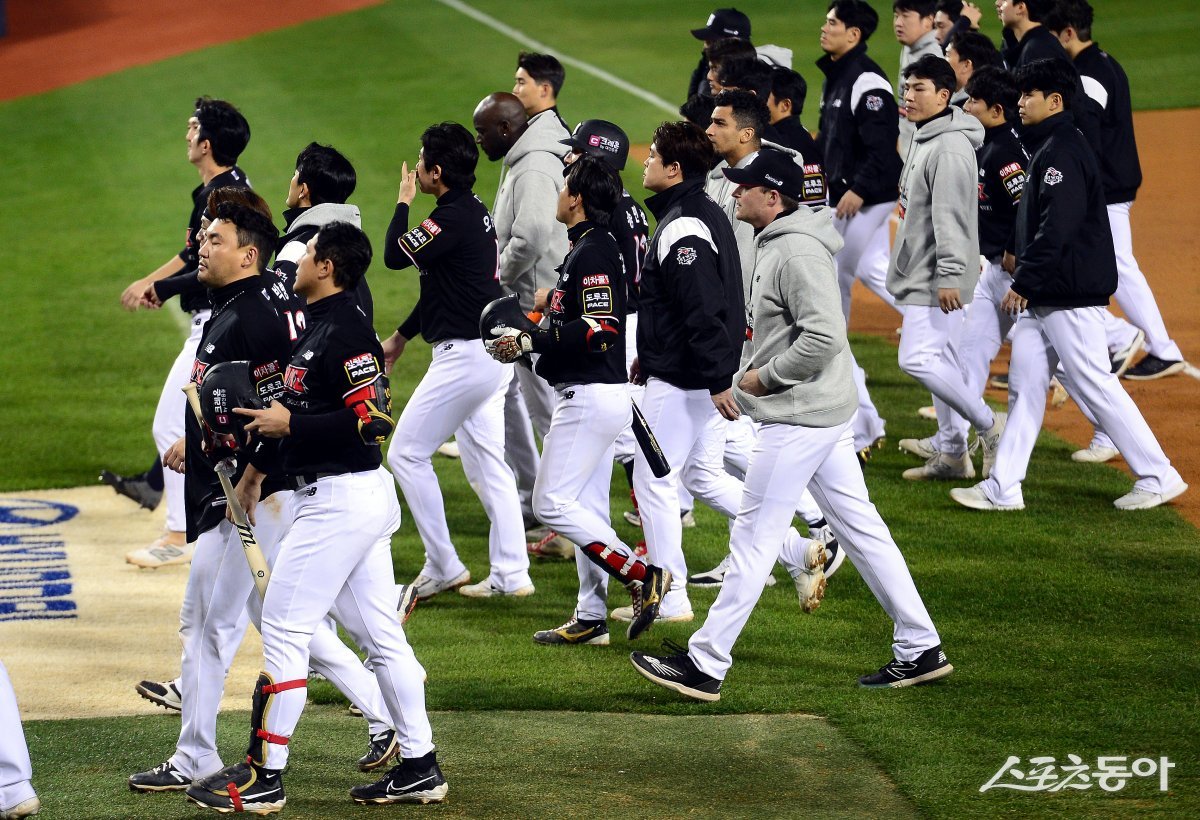 8일 서울 잠실야구장에서 ‘2023 신한은행 SOL KBO리그’ LG 트윈스와 kt 위즈의 한국시리즈 2차전 경기가 열렸다. LG에 4-5로 패한 kt 선수들이 더그아웃으로 향하고 있다.