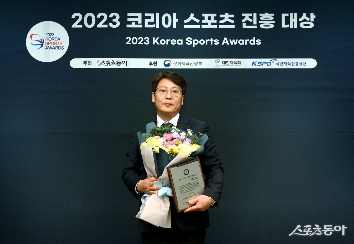 스포츠동아가 주최하고 문화체육관광부, 대한체육회, 국민체육진흥공단이 후원하는 ‘2023 코리아 스포츠진흥 대상’ 시상식이 9일 서울 서대문구 동아일보 충정로 사옥에서 개최됐다. 스포츠행정 리더 부문을 수상한 인천광역시 중구 이재성 홍보체육실장이 기념촬영을 하고 있다.