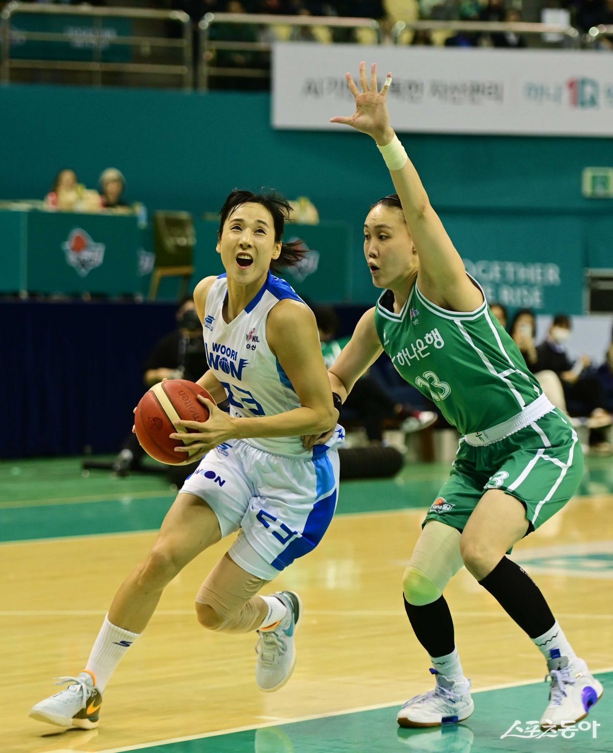 9일 경기도 부천실내체육관에서 열린 ‘우리은행 우리WON 2023-2024 여자프로농구’ 부천 하나원큐와 아산 우리은행의 경기에서 우리은행 김단비가 하나원큐 김정은의 수비를 뚫고 드리블 돌파를 하고 있다.