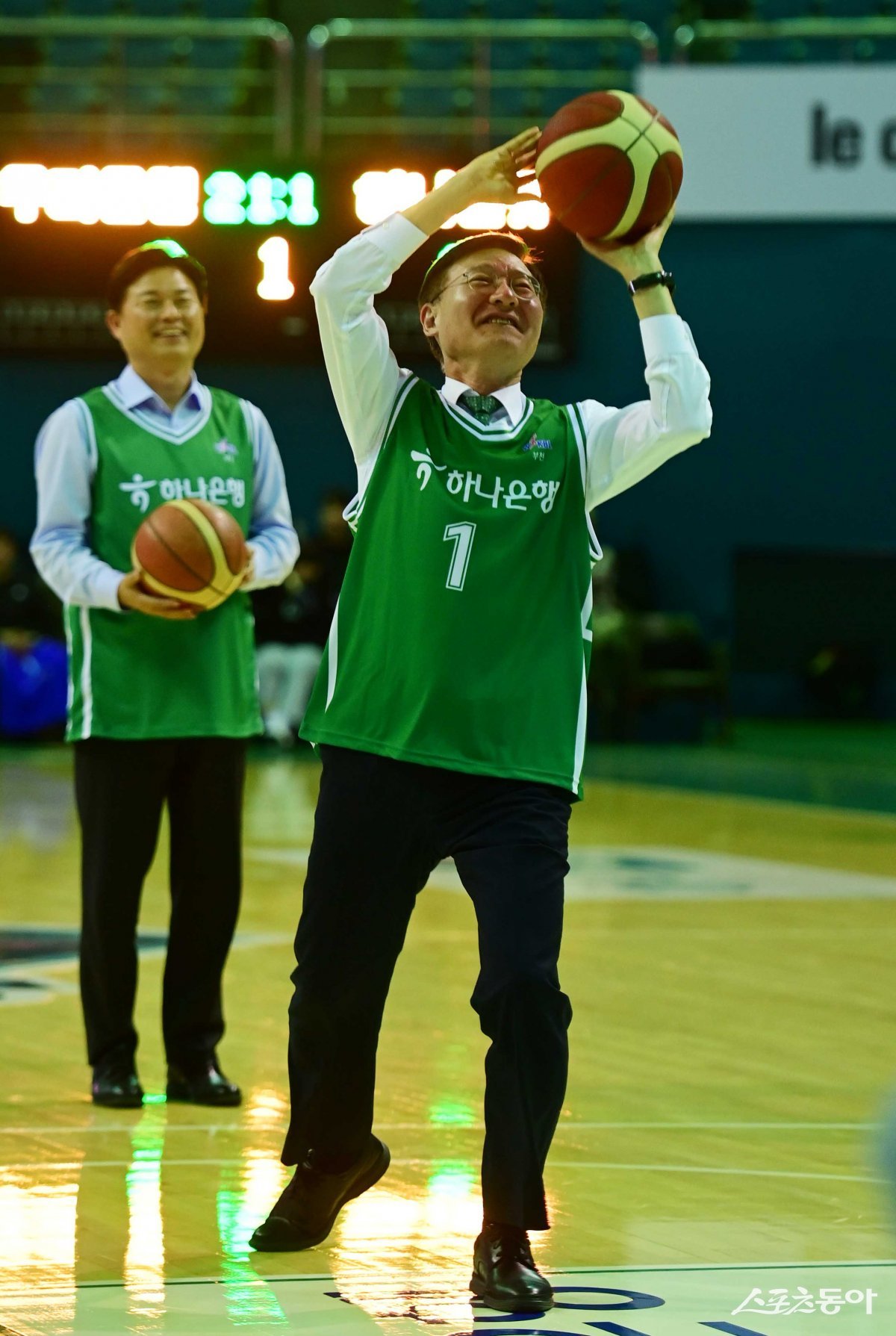 9일 경기도 부천실내체육관에서 열린 ‘우리은행 우리WON 2023-2024 여자프로농구’ 부천 하나원큐와 아산 우리은행의 경기에 앞서 하나원큐 이승열 구단주가 시투를 하고 있다.
