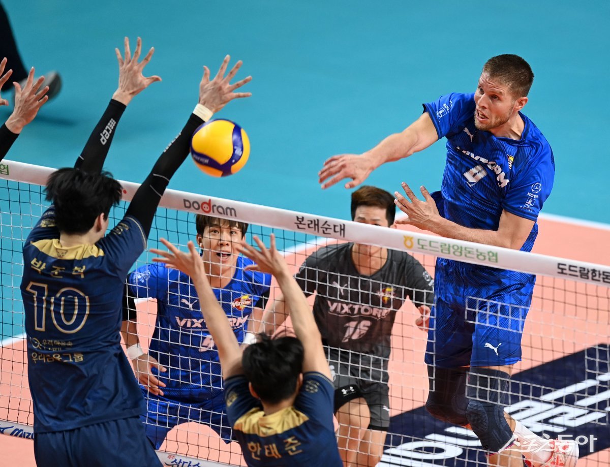 9일 서울 장충체육관에서 열린 ‘도드람 2023~2024 V-리그’ 남자부 우리카드와 한국전력 경기에서 한국전력 타이스가 우리카드의 블로킹 사이로 스파이크를 날리고 있다.