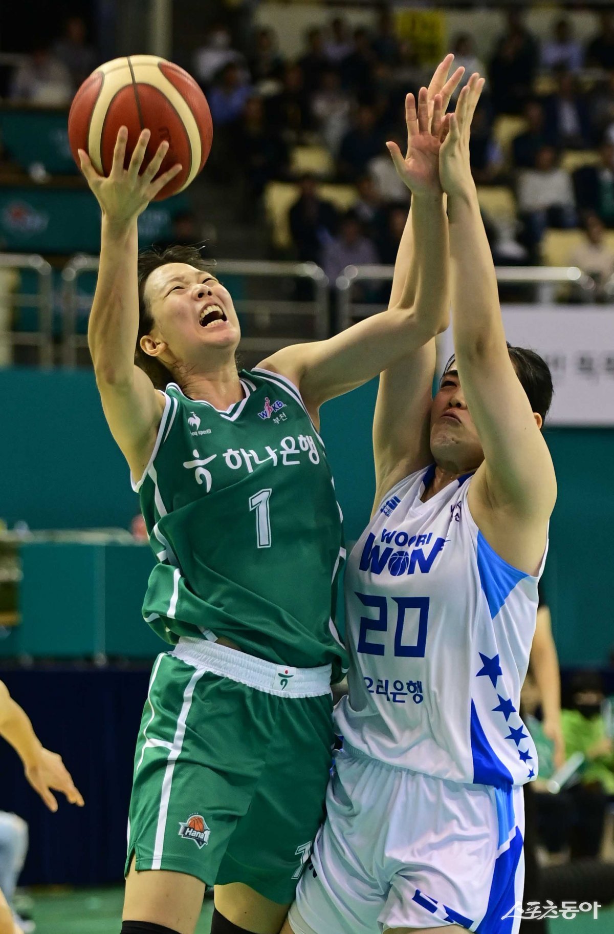 9일 경기도 부천실내체육관에서 열린 ‘우리은행 우리WON 2023-2024 여자프로농구’ 부천 하나원큐와 아산 우리은행의 경기에서 하나원큐 신지현이 우리은행 수비 앞에서 슛을 하고 있다.