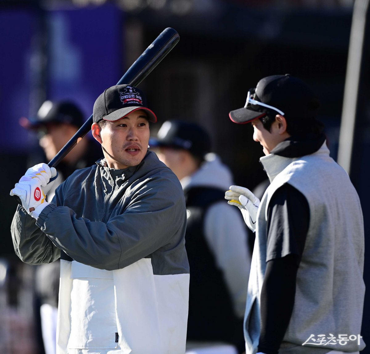 10일 경기도 수원KT위즈파크에서 열린 ‘2023 KBO 포스트시즌’ LG 트윈스와 KT 위즈의 한국시리즈 3차전 경기에 앞서 KT 배정대가 동료와 이야기를 하고 있다.