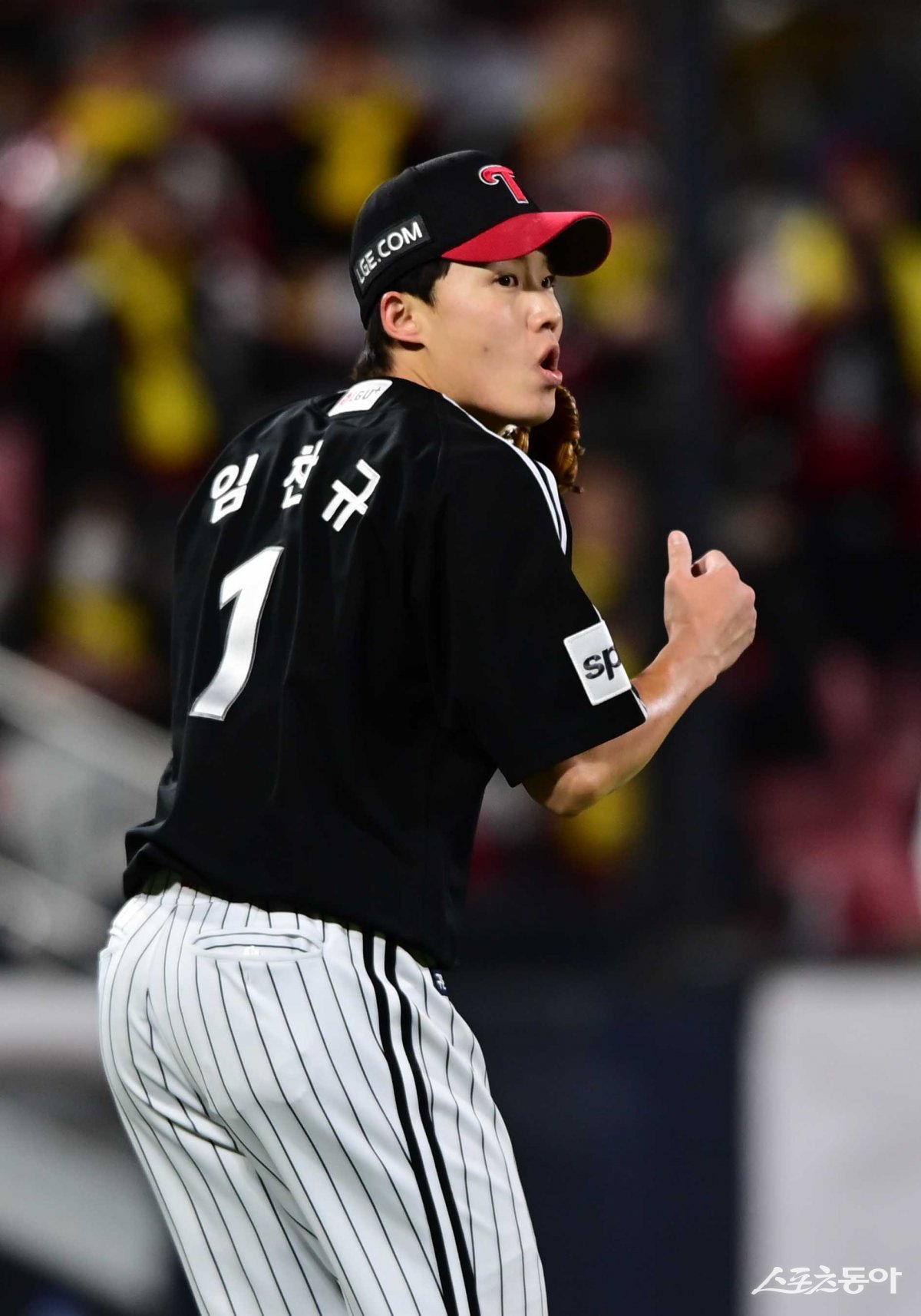 10일 경기도 수원KT위즈파크에서 열린 ‘2023 KBO 포스트시즌’ LG 트윈스와 KT 위즈의 한국시리즈 3차전 경기에서 1회말 1사 1, 2루 KT에 병살타를 유도한 LG 임찬규가 1루 송구를 지켜보고 있다.
