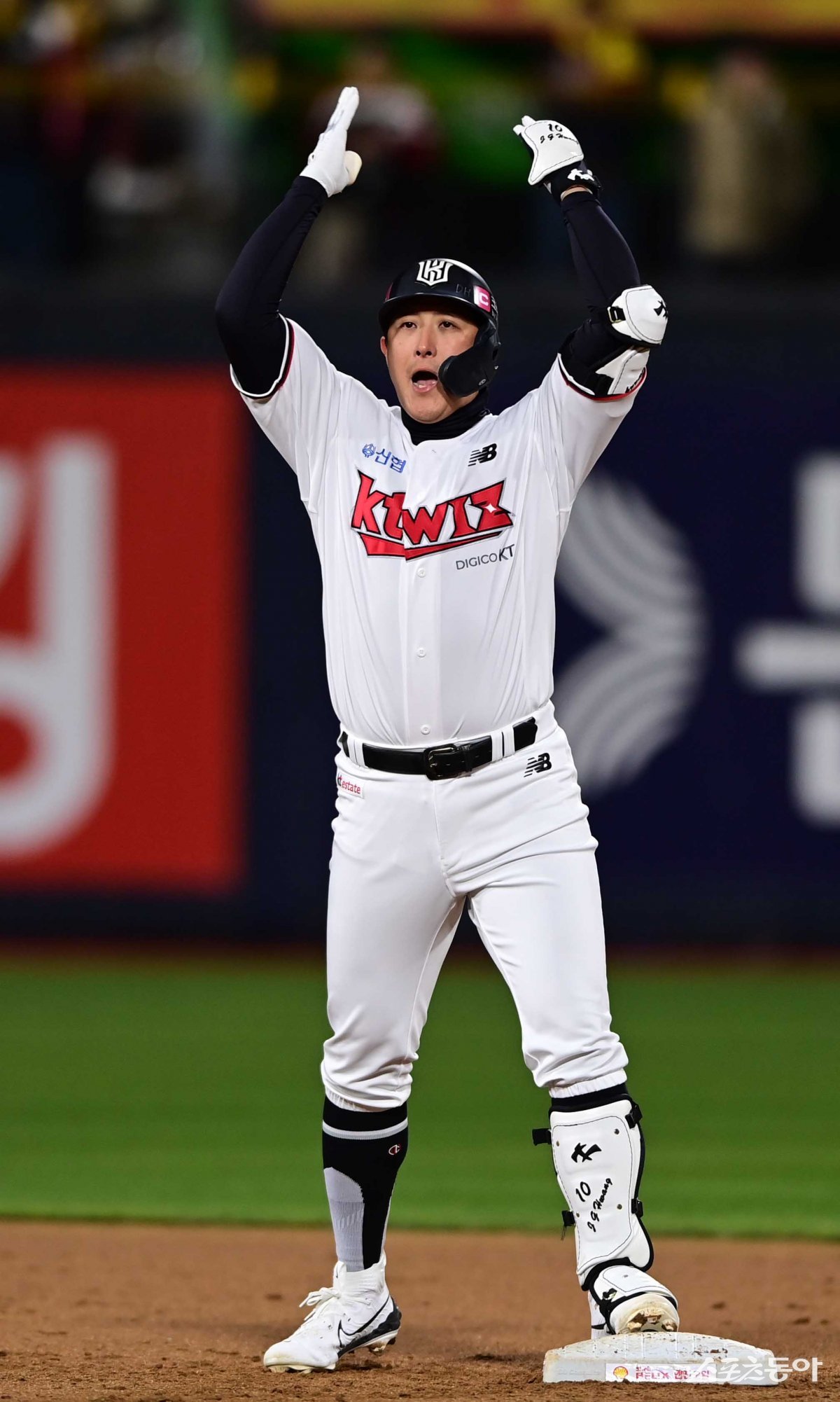 10일 경기도 수원KT위즈파크에서 열린 ‘2023 KBO 포스트시즌’ LG 트윈스와 KT 위즈의 한국시리즈 3차전 경기에서 3회말 무사 1, 2루 KT 황재균이 1타점 중전 2루타를 친 후 세리머니를 하고 있다.