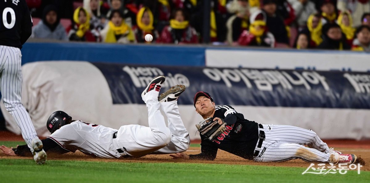 10일 경기도 수원KT위즈파크에서 열린 ‘2023 KBO 포스트시즌’ LG 트윈스와 KT 위즈의 한국시리즈 3차전 경기에서 5회말 1사 1루 KT에 땅볼 때 LG 문보경이 송구된 볼을 놓치고 있다.