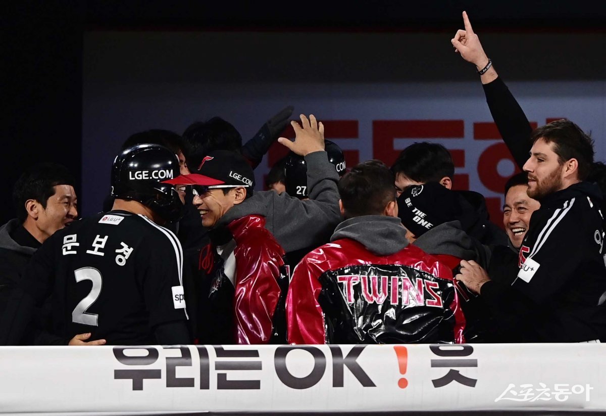 10일 경기도 수원KT위즈파크에서 열린 ‘2023 KBO 포스트시즌’ LG 트윈스와 KT 위즈의 한국시리즈 3차전 경기에서 6회초 무사 1루 KT 박동원이 역전 2점 홈런을 친 후 염경엽 감독과 함께 기쁨을 나누고 있다.