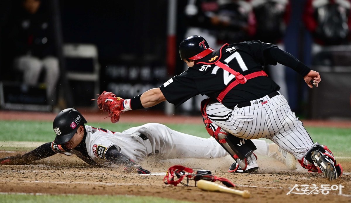10일 경기도 수원KT위즈파크에서 열린 ‘2023 KBO 포스트시즌’ LG 트윈스와 KT 위즈의 한국시리즈 3차전 경기에서 5회말 1사 2, 3루 KT에 땅볼 때 3루주자 김민혁이 홈으로 파고들었지만 LG 포수에게 태그 아웃되고 있다.