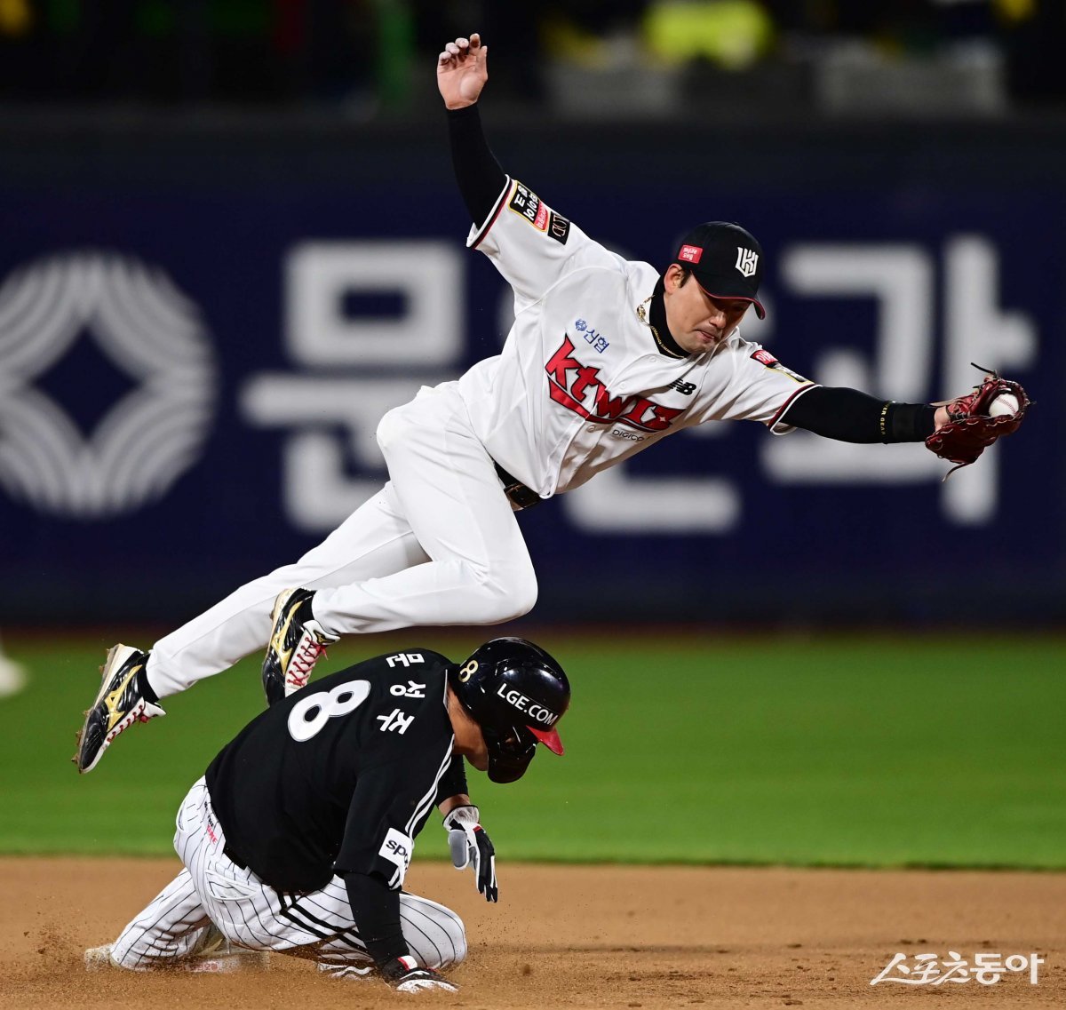10일 경기도 수원KT위즈파크에서 열린 ‘2023 KBO 포스트시즌’ LG 트윈스와 KT 위즈의 한국시리즈 3차전 경기에서 6회초 무사 1루 LG에 땅볼 때 KT 김상수가 1루주자를 포스 아웃시키고 있다.