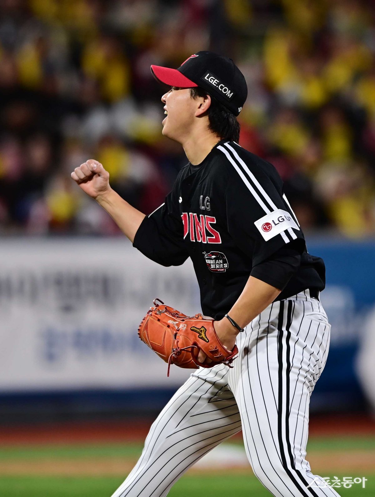 10일 경기도 수원KT위즈파크에서 열린 ‘2023 KBO 포스트시즌’ LG 트윈스와 KT 위즈의 한국시리즈 3차전 경기에서 7회말 수비를 무실점으로 마친 LG 유영찬이 기뻐하고 있다.